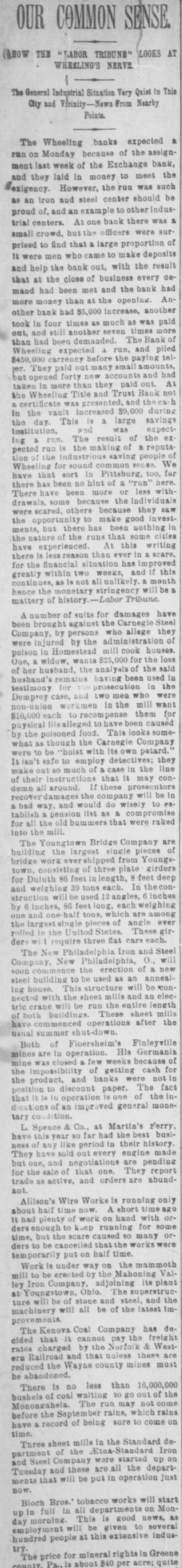 OUR COMMON SENSE. (HOW THE LABOR TRIBUNE" LOOKS AT WHEELING'S NERVE. The General Industrial Situation Very Quiet in This City and Vicinity-News From Nearby Points. The Wheeling banks expected a run on Monday because of the assignment last week of the Exchange bank, and they laid in money to meet the exigency. However, the run was such as an iron and steel center should be proud of, and an example to other industrial centers. At one bank there was a small crowd, but the officers were surprised to find that & large proportion of It were men who came to make deposits and help the bank out, with the result that at the close of business every aemand had been met and the bank had more money than at the opening. Another bank had $5,000 increase, another took in four times as much as was paid out, and still another seven times more than had been demanded. The Bank of Wheeling expected a run, and piled $450,000 carrency before the paying teler. They paid out many small amounts, but opened forty new accounts and had taken in more than they paid out. At the Wheeling Title and Trust Bank not a certificate was presented, and the cas h in the vault increased $9,000 during the day. This is a large savings institution, and was expecting a run. The result of the ex pected run is the making of a reputation of the industrious saving people of Wheeling for sound common sense. We have that sort in Pittsburg, too, for there has been no hint of a "run" here. There have been more or less withdrawals, some because the individuals were scared, others because they saw the opportunity to make good investments, but there has been nothing in the nature of the runs that some cities have experienced. At this writing there is less reason than ever in a scare. for the financial situation has improved greatly within two weeks, and if this continues, as is not all unlikely. a month hence the monetary stringency will be & mattery of history.-Labor Tribune. A number of suits for damages have been brought against the Carnegie Steel Company, by persons who allege they were injured by the administration of poison in Homestead mill cook houses. One, a widow, wants $25,000 for the loss of her husband, the analysis of the said husband's remains having been used in testimony for the prosecution in the Dempsey case, and two men who were non-union workmen in the mill want $10,000 each to recompense them for physical salleged to have been caused by the poisoned food. This looks somewhat as though the Carnegie Company were to be "hoist with its own petard. It isn't safe to employ detectives; they make out 80 much of & case in the line of their instructions that it may condemn all around. If these prosecutors recover damages the company will be in a bad way, and would do wisely to establish & pension list as & compromise for all the old bummers that were raked into the mill. The Youngtown Bridge Company are building the largest single pieces of bridge work ershipped from Youngstown, consisting of three plate girders for Duluth 86 feet in length, 8 feet deep and weighing 39 tons each. In the construction will be used 12 angles, 6 inches by 6 Inches, 86 feet long, each weighing one and one- half tons, which are among the largest single pieces of angle ever rolled in the Unitod States. These girders will require three flat cars each. The New Philadelphia Iron and Steel Company, New Philadelphia, 0., will soon commence the erection of & new steel building to be used as an annealing house. This structure will be *connected with the sheet mills and an electric crane will be run the entire length of both buildings. These sheet mills have commenced operations after the usual summer shut-down. Both of Floersheim's Finleyville mines are in operation. His Germania mine was closed & few weeks because of the impossibility of getting cash for the product, and banks were not in position to discount paper. The fact that it is in operation is one of the indieations of an improved general monetary condition. L. Spence & Co., at Martin's Ferry. have this year so far had the best bustness of any like period in their history. They have sold out every engine made but one, and negotiations are pending for the sale of that one. They report trade as active, and orders are abundant. Allison's Wire Works is running only about half time now. A short time ago It had plenty of work on hand with orders enough to keep running for some time, but the scare caused so many orders to be cancelled that the works were temporarily put on half time. Work is under way on the mammoth mill to be erected by the Mahoning Valley Iron Company, adjoining its plant at Youngstown, Ohio. The superstructure will be of stone and steel, and the machinery will all be of the latest improvements. The Kenova Coal Company has decided that it cannot pay the freight rates charged by the Norfolk & Western Railroad and that unless these are reduced the Wayne county mines must be abandoned. There is no less than 16,000,000 bushels of coal waiting to go out of the Monongahela. The run may not come before the September rains, which rains have & record of being sure to come on time. Three sheet mills in the Standard department of the Etna-Standard Iron and Steel Company ware started up on Tuesday and these are all the departments that will be put in operation just now. Bloch Bros.' tobacco works will start up in full in all departments on Monday morning. This is good news, as employment will be given to several hundred people at this extensive industry. The price for mineral rights in Greene