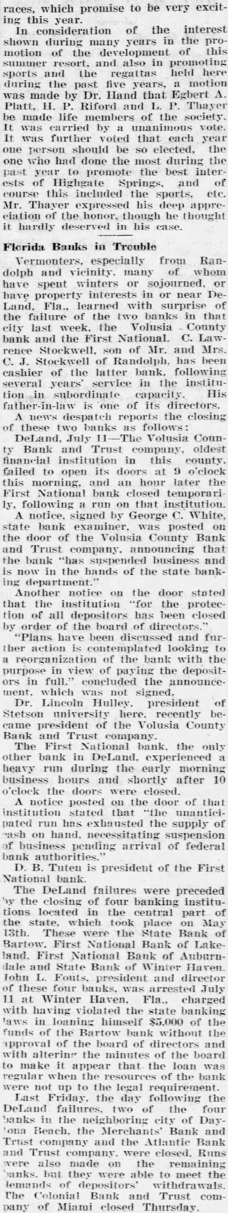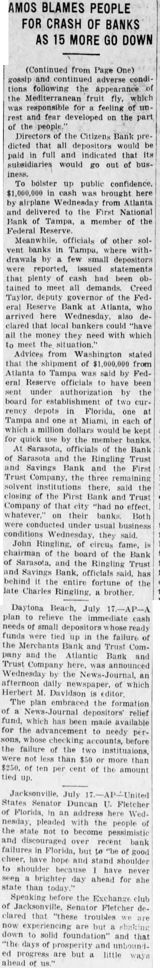 14 SOUTH FLORIDA BANKS ARE CLOSED Total Failures in Past Two Weeks Reaches 22, With Collapse of Chain. By the Associated Press. TAMPA, Fla., July 17.-Fourteen State banks in Southwest Florida closed their doors today, bringing to 23 the number of financial institutions to fail within the State in the past two weeks. Following the closing of the Citizens' Bank & Trust Co. of Tampa and nine subsidiary institutions here and in nearby counties today, it was learned that five other banks in this territory also had failed. Total deposits in the Tampa banks involved was $17,347,968.15, of which the Citizens' Bank & Trust held $13;695.870.78. Total assets of the Tampa banks were $22,927,003.36. The institutions placed in the hands of the State banking department today were: The Citizens" Bank & Trust Co., Tampa Franklin Bank, Tampa. The Lafayette Bank, Tampa. American State Bank, Tampa. The Citizens' Nebraska Avenue Bank, Tampa. The Bank of Ybor City, at Ybor City, on which there was a run Monday. The Bank of Plant City, Plant City. The Bradenton Bank & Trust Co., Bradenton. The First Bank & Trust Co., Sarasota. First State Bank of Fort Meade. The Bank of Pasco County, Dade City. First Bank of Port Tampa City. Bank of Mulberry, at Mulberry. Ellenton State Bank, Ellenton. Other institutions which have closed their doors within the past two weeks are: Peoples State Bank, Jacksonville. Volusia County Bank & Trust Co., Deland. First National Bank, Deland. Colonial Bank & Trust Co., Miami. Merchants' Bank & Trust Co., Daytona Beach. Atlantic Bank & Trust Co., Daytona Beach. First National Bank, Sanford. Merchants' Bank, Melbourne. Capital and surplus of the 15 institutions that closed today, according to figures released by the State banking department, totaled $3,890,000. Deposits aggregated $22,283,963.61 and assets $29,679,107.51. Deposits of the eight banks which failed during the two weeks prior to today were estimated at $10,800,000, bringing the total deposits tied up in bank failures to date at $33,083,963.61. E. P. Jackson, State examiner, has been here since Monday checking up on condition. Capt. R. A. Gray, assistant to the State controller, was expected from Tallahassee at noon to take charge. The board of directors of the Citizens' Bank & Trust Co. predicted that all depositors would be paid in full and that the depositories would go out of business. EXPLAINS BANK FAILURES.