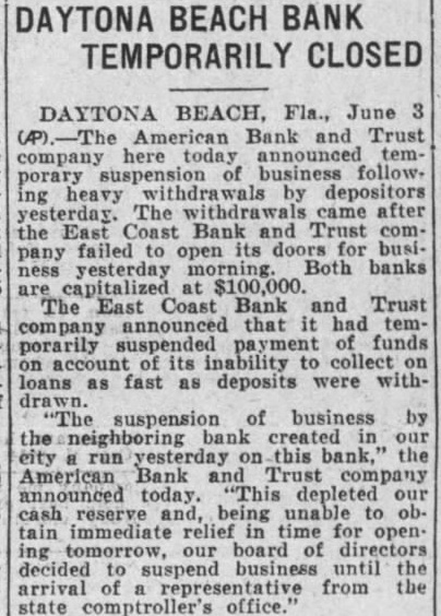 DAYTONA BEACH BANK TEMPORARILY CLOSED BEACH, Fla., June 3 DAYTONA Bank and Trust company announced temporary suspension by The came after yesterday. the East Bank and Trust comfailed its busiBoth banks yesterday $100,000. Coast Bank and Trust announced that had temcompany porarily funds its collect loans as fast as deposits drawn. suspension of business by the created yesterday this American Bank Trust company announced today. reserve immediate time for openboard decided suspend until arrival from state