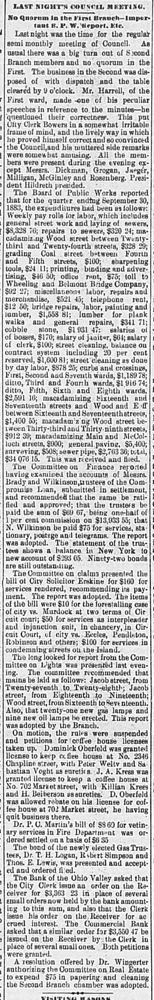 LAST NIGHTS COUNCIL Firml BranchNo Quorum in B. P. the W. deport. for Etc. the regular As night fant was the time of Council. semi Last monthly meeting big turn out of in cond the usual there was a and no quorum was disbusiness in the table First Branch The members dispatch the Second and of the of with Mr. Harrell, posed by 9 o'clock. of his peculiar he ward, the put cleared First in reference made correctness. one to minutes This irritable questioned speeches their in a somewhat in which Clerk Bowers and the lively way 80 wuttered the memthe he frame City proved of mind, himself his correct and side remarks Janger, vinced Council, somew and hat amusing. during the All evening except Milligan, McGinley were bers were Meears. present Dickman, and Rosenberg. Grogan, PresiBoard of The Hildreth Public ending Works September as for the had which 1883, the expenditu for labor, of that dent penditures quarter presided. been reported includes follows: sewere, 30, pay rolls and laying 24; 76; street $328 Twenty- between cadamiz.ng $8,328 general Weekly street repairs Wood work to fourth sewere, between streets, $320 Twenty- Fourth ma- 29; third and Coal street $100; sharpening adver Fifth streets, binding and toll 50; office Bridge tising, grading and tools, $24 11; $40 printing, Belmont rent, $75; Company, and to telephone Wheeling iscellaneous and labor, repairs rent, and $92 27; $521 45; labor, painting for $12 50; bridge 81; lumber $341 71; lumber, and general 931 47: salaries merchandise, $1,558 repairs, repairs, salary plank of walks cobble $170; stone, salary cleaning, of jaoiter, balance $64; cent on clerk, cleaning as contract 81; street and of of reserved, , system $100; $1,600 $878 street including 25; curbs wards, 20 crossings, per $1,189.78 done by day labor, and Seventh wards, $1.9167 First, Second and Fourth Eighth wards, ditto, Sixth and Mixteenth and ditto, Wood Third 16; Fit macadamizing and enteenthstreets, and E Styventh $2,591 streets and Seventeenthstr Wood street bebetween Sixteenth ng ninthstreets, third and Main and 39; general 36; surveying, $1,400 5 $912 tween Thirty macadamizing macadam $000; Thirty paving. $2,763 McCol- $5,400; total, was loch streets, $508; sewer received pipe, and rer filed. orted $34 076 15. This Finance Messrs. The the of the having Wilkinson in rati and examined Committee submitted on accounts instees settlement, of be Com prourecommended Brady Loan, that the the same trustefs be and and approved; $69 67, being 55; that cent $75 for The fied paid per the sum commission of be paid that on $13,933 services, one-half report sta N. Wilkinson and telegrams. of the trus tionary, postage The statement New York to tees WAS adopted. account shows a of balance $293 05. in Ninety-two bonds the are new still outstanding on claims presented for $160 for The Committee Solicitor commending Erskine its pay City The items The report $10 for the terms of of the bill were Murdock at two ment. services bill of rendered, was adopted. forestalling as interpleader case Oir Cirof city VS. $50 for services chancery, in of city VS. for services cuit cuit and Court, court; injunction others; suit, in $100 Eccles, Island. Pandleton, in The Robineon & condemning and looked streets for oil report the from last the even- Com The long Lights was presented recommended from that mains be laid as to Twenty ing. mittee on committee follows: Jacob street, to -eighth; Nineteenth; nteenth. Jacob from Sixteenth to Seve and that street, twenty one be new erected. This new by the were motion, the coffee house nine street, was Wood Also, On adopted oil from lam for p8 rules Branch. gas was lamps suspended licenses granted report petitions Oberfeld at No. 2346 up. ccflee house and to with Pater J. A. Kress was as enretics. a coffee house and taken license Chapline Voght straer, keep Dominick Weltv Krees Sa at bastian license to keep with Killian Oberfeld granted Marke street, Bureties. D. for house at and allowed H. rebate on his street, he fee was No. 702 Beiberson 702 there. Market license $8.60 for having vetin- cof- or quit Dr. business P.O. Martin'a Fire bill Department of was ary services in on a basis Gas dered settled bond of the newly sbert elected Simpson Trus and tees, E. Lewis, was ed. The Dr. T. H. Logan, presented and accept that asked Thos. ed The and Bank ordered of the fi issue Ohio an Valley order on of the several Rethe City Clerk 23 in place bank amountand ceiver orders for $3,363 now held by also the that the for Clerk ac email to this sum, the Commercial Receiver Bank be on issued of place several smallones. issue crued asked ing that his interest. order the a eimilar Receiver on The order by for Both the $3,550 Clerk petitions 47 in Wingerter were granted. offered by Dr. on Real Estate the Second A resolution the Committee papering and adopted. cleaning to authorizing expend $75 Branch in chamber was