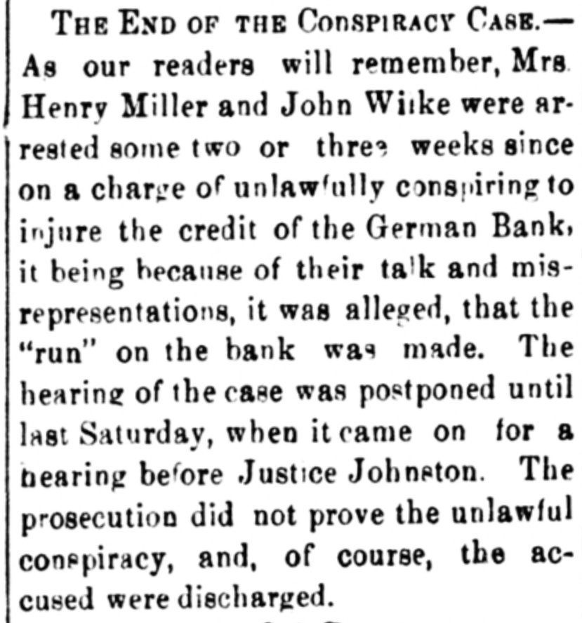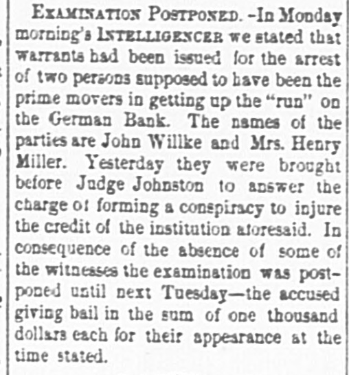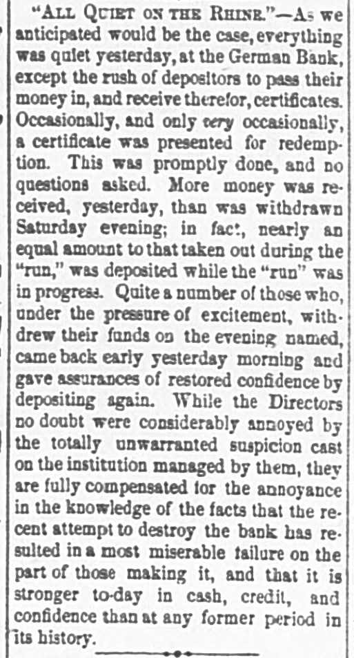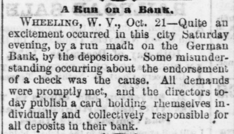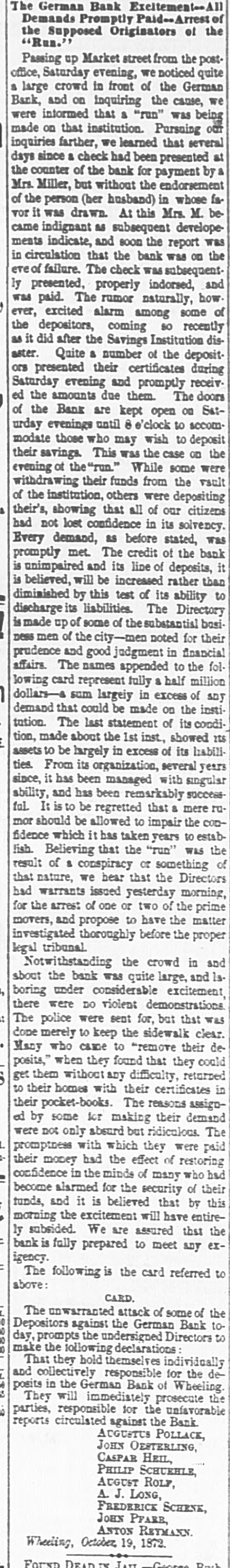 The German Bank Excitement--All Demands Promptly Paid-Arrest the Supposed Originators of the "Run." Passing up Market street from the postoffice, Saturday evening, we noticed quite s large crowd in front of the German Bank, and on inquiring the cause, we that s "run" was were informed Pursuing being our made on that institution. inquiries farther, we learned that several days since a check had been presented at of the bank for payment by but without the the Mrs. counter Miller, endorsement whose of the person (her husband) in vor it was drawn At this Mrs. M. became indignant as subsequent developements indicate, and soon the report was in circulation that the bank was on the The check was subsequentproperly ly presented, of failure. indorsed, and The rumor excited alarm among ever, was paid. naturally, some recently how. of the depositors, coming so as after the it did Savings Institution disaster. Quite a number of the depositors presented their certificates during Saturday evening and promptly receivamounts due them. The doors Bank are kept open on ed of the the Saturday evenings until 8 e'clock to accommodate those who may wish to deposit their savings. This was the case on the of the "run" some were evening While from the vault withdrawing their funds others were of the institution, of depositing citizens their's, showing that all our lost confidence in as had Every not demand, before its stated, solvency. was met. The and its line promptly is unimpaired credit of of deposits, the bank will be increased rather than this test is diminished believed, by of its ability Directory to discharge its liabilities. The is made up of some of the substantial basiness men of the city-men noted for their prudence and good jadgment in financial affairs. The names appended to the following card represent fully a half million dollars sum largely in excess of any demand that could be made on the institution. The last statement of its coodition, made about the 1st inst., showed Its assets to be largely in excess of its habiliFrom its organization, several years it has been managed since, ties. remarkably with singular ability, and has been successful It is to be regretted that a mere mor should be allowed to impair the CODit has taken years to that the was fish. fidence Believing which "run" estab- the result of & conspiracy or something of that nature, we hear that the Directors had warrants issued yesterday morning, for the arrest of one or two of the prime movers, and propose to have the matter investigated thoroughly before the proper legal tribunal Notwithstanding the crowd in and large, and la. about the bank was quite boring under considerable excitement there were DO violent demonstrations. The police were sent for, but that done to keep the merely sidewalk their clear. Many who came to "remove dewhen they found without any posits," get them difficulty, that they returned could to homes with their certificates in their reasons their pocket-books. The their demand assignad by some for making were not only absurd but ridicalous. The promptness with which they were paid their money had the effect of restoring confidence in the minds of many who had become alarmed for the security of their funds, and it is believed that by this morning the excitement will have entirely subsided. We are assured that the bank is fully prepared to meet any exigency. The following is the card referred to above: CARD. unwarranted attack of some of the the to Depositors The against German Bank the undersigned Directors make the hold individually ay,prompts That they iollowing themselves declarations and in the German Bank of will posits collectively immediately responsible prosecute for Wheeling. the the defor circulated against parties, reports They responsible the the unfavorable Bank. AUGUETUS POLLACE, JOHN OESTERLING, CASPAR HEIL, PHILIP SCHUEHLE, AUGUST ROLF, A J. LONG, FREDERICK SCHENE, JOHN PFARE, ANTON REYMANN. Wheeling, October 19, 1872 FOUSD DEAD IX INTE Cooree