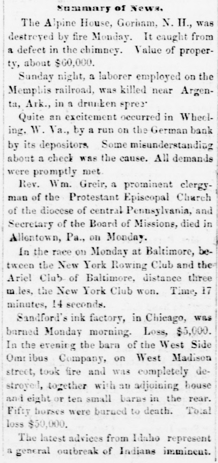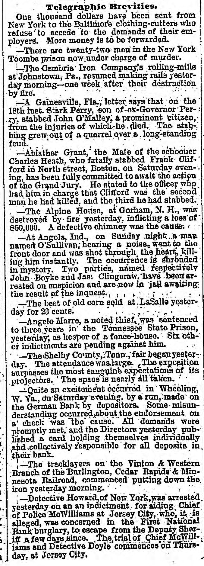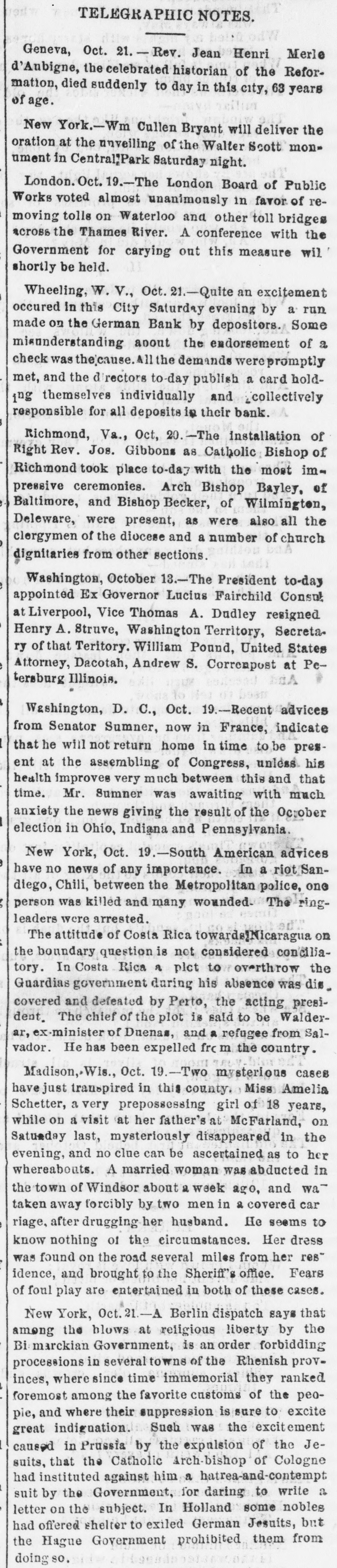 The German Bank Excitement--All Demands Promptly Paid-Arrest the Supposed Originators of the "Run." Passing up Market street from the postoffice, Saturday evening, we noticed quite s large crowd in front of the German Bank, and on inquiring the cause, we that s "run" was were informed Pursuing being our made on that institution. inquiries farther, we learned that several days since a check had been presented at of the bank for payment by but without the the Mrs. counter Miller, endorsement whose of the person (her husband) in vor it was drawn At this Mrs. M. became indignant as subsequent developements indicate, and soon the report was in circulation that the bank was on the The check was subsequentproperly ly presented, of failure. indorsed, and The rumor excited alarm among ever, was paid. naturally, some recently how. of the depositors, coming so as after the it did Savings Institution disaster. Quite a number of the depositors presented their certificates during Saturday evening and promptly receivamounts due them. The doors Bank are kept open on ed of the the Saturday evenings until 8 e'clock to accommodate those who may wish to deposit their savings. This was the case on the of the "run" some were evening While from the vault withdrawing their funds others were of the institution, of depositing citizens their's, showing that all our lost confidence in as had Every not demand, before its stated, solvency. was met. The and its line promptly is unimpaired credit of of deposits, the bank will be increased rather than this test is diminished believed, by of its ability Directory to discharge its liabilities. The is made up of some of the substantial basiness men of the city-men noted for their prudence and good jadgment in financial affairs. The names appended to the following card represent fully a half million dollars sum largely in excess of any demand that could be made on the institution. The last statement of its coodition, made about the 1st inst., showed Its assets to be largely in excess of its habiliFrom its organization, several years it has been managed since, ties. remarkably with singular ability, and has been successful It is to be regretted that a mere mor should be allowed to impair the CODit has taken years to that the was fish. fidence Believing which "run" estab- the result of & conspiracy or something of that nature, we hear that the Directors had warrants issued yesterday morning, for the arrest of one or two of the prime movers, and propose to have the matter investigated thoroughly before the proper legal tribunal Notwithstanding the crowd in and large, and la. about the bank was quite boring under considerable excitement there were DO violent demonstrations. The police were sent for, but that done to keep the merely sidewalk their clear. Many who came to "remove dewhen they found without any posits," get them difficulty, that they returned could to homes with their certificates in their reasons their pocket-books. The their demand assignad by some for making were not only absurd but ridicalous. The promptness with which they were paid their money had the effect of restoring confidence in the minds of many who had become alarmed for the security of their funds, and it is believed that by this morning the excitement will have entirely subsided. We are assured that the bank is fully prepared to meet any exigency. The following is the card referred to above: CARD. unwarranted attack of some of the the to Depositors The against German Bank the undersigned Directors make the hold individually ay,prompts That they iollowing themselves declarations and in the German Bank of will posits collectively immediately responsible prosecute for Wheeling. the the defor circulated against parties, reports They responsible the the unfavorable Bank. AUGUETUS POLLACE, JOHN OESTERLING, CASPAR HEIL, PHILIP SCHUEHLE, AUGUST ROLF, A J. LONG, FREDERICK SCHENE, JOHN PFARE, ANTON REYMANN. Wheeling, October 19, 1872 FOUSD DEAD IX INTE Cooree