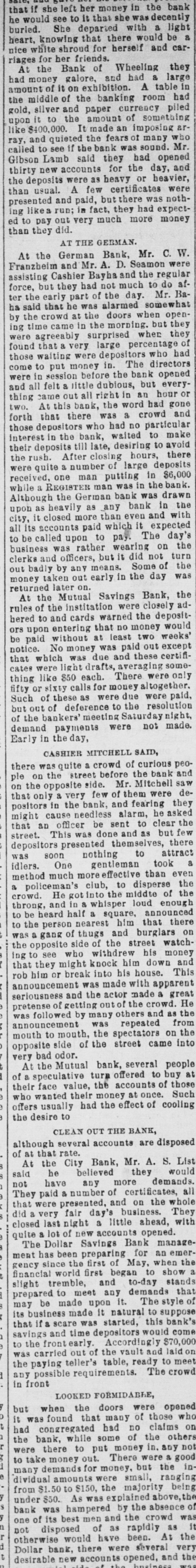 that if she left her money in the bank he would see to it that she was decently buried. She departed with a light heart, knowing that there would be & nice white shroud for herself and carriages for her friends. At the Bank of Wheeling they had money galore, and had a large amount of it on exhibition. A table in the middle of the banking room had gold, silver and paper currency piled upon it to the amount of something like $400,000. It made an imposing array, and quieted the fears of many who called to see if the bank was sound. Mr. Gibson Lamb said they had opened thirty new accounts for the day, and the deposits were as heavy or heavier, than usual. A few certificates were presented and paid, but there was nothing likea run; in fact, they had expected to pay out very much more money than they did. AT THE GERMAN. At the German Bank, Mr. C. W. Franzbeim and Mr. A. D. Seamon were assisting Cashier Bayha and the regular force, but they had not much to do after the early part of the day. Mr. Baha said that he was alarmed somewhat by the crowd at the doors when opening time came in the morning. but they were agreeably surprised when they found that a very large percentage of those waiting were depositors who had come to put money in. The directors were in session before the bank opened and all felt a little dubious, but everything came out all right in an hour or two. At this bank, the word had gone forth that there was a crowd and those depositors who had no particular interest in the bank, waited to make their deposits till late, desiring to avoid the rush. After closing hours, there were quite a number of large deposits received, one man putting in $6,000 while a REGISTER man was in the bank. Although the German bank was drawn upon as heavily as any bank in the city, it closed more than even and with all its accounts paid which it expected to be called upon to pay. The day's business was rather wearing on the clerks and officers, but it did not turn out badly by any means. Some of the money taken out early in the day was returned later on. At the Mutual Savings Bank, the rules of the institation were closely adhered to and cards warned the depositors upon entering that no money would be paid without at least two weeks' notice. No money was paid out except that which was due and these certificates were light drafts, averaging something like $50 each. There were only fifty or sixty calls for money altogether. Such of these as were due were paid, but out of deference to the resolution of the bankers' meeting Saturday night, demand payments were not made. Early in the day, CASHIER MITCHELL SAID, there was quite a crowd of curious people on the street before the bank and on the opposite side. Mr. Mitchell saw that only a very few of them were depositors in the bank, and fearing they might cause needless alarm, he asked that an officer be sent to clear the street. This was done and as but few depositors presented themselves, there was soon nothing to attract idlers. One gentleman took a method much more effective than even a policeman's club, to disperse the crowd. He got into the middte of the throng, and in a whisper loud enough to be heard half a square, announced to the person nearest him that there was a gang of thugs and burglars on the opposite side of the street watching to see who withdrew his money that they might knock him down and rob him or break into his house. This announcement was made with apparent seriousness and the actor made a great pretense of getting out of the crowd. He was followed by many others and as the announcement was repeated from mouth to mouth, the spectators on the opposite side of the street came into very bad odor. At the Mutual bank, several people of a speculative turn offered to buy at their face value, the accounts of those who wanted their money at once. Such offers usually had the effect of cooling the desire to CLEAN OUT THE BANK, although several accounts are disposed of at that rate. At the City Bank, Mr. A. S. List said he believed they would not have any more demands. They paid & number of certificates, all that were presented, and on the whole did a very fair day's business. They closed last night a little ahead, with quite a lot of new accounts opened. The Dollar Savings Bank management has been preparing for an emergency since the first of May, when the financial world first began to show a slight tremble, and to-day stands prepared to meet any demands that may be made upon it. The style of its business made it natural to suppose that if a scare was started, this bank's savings and time depositors would come to the front early. Accordingly $70,000 was carried out of the vault and laid on the paying teller's table, ready to meet any possible requirements. The crowd in front LOOKED FORMIDABLE, but when the doors were opened it was found that many of those who had congregated had no claims on the bank, while some of the others were there to put money in. any not to take money out. There were a good many demands for money, but the in dividual amounts were small, ranging from $1.50 to $150, the majority being under $50. As was explained above, the bank was hampered by the absence