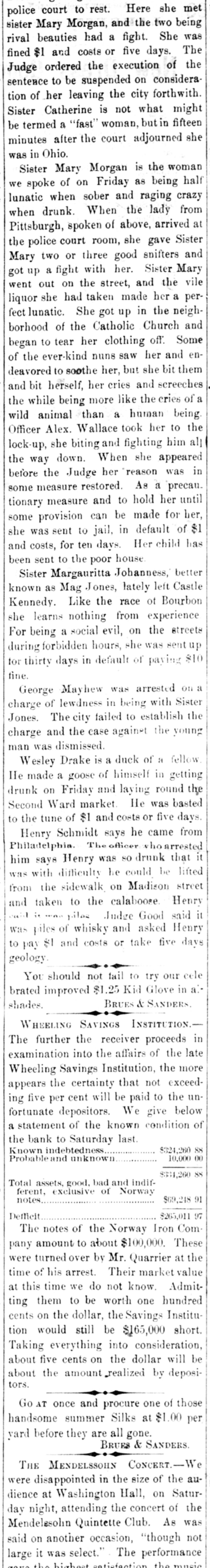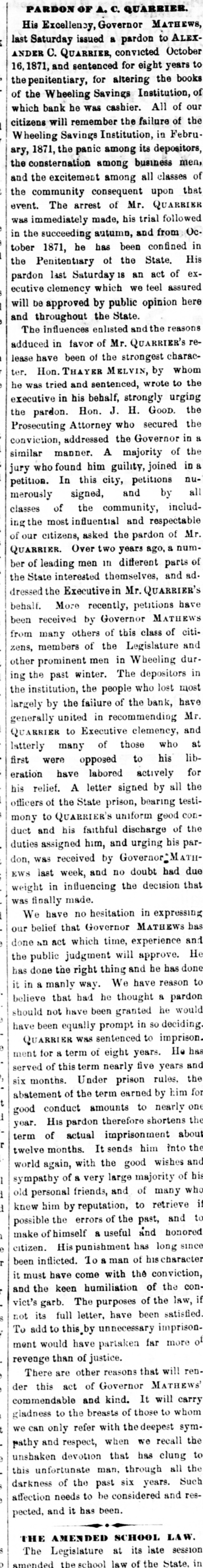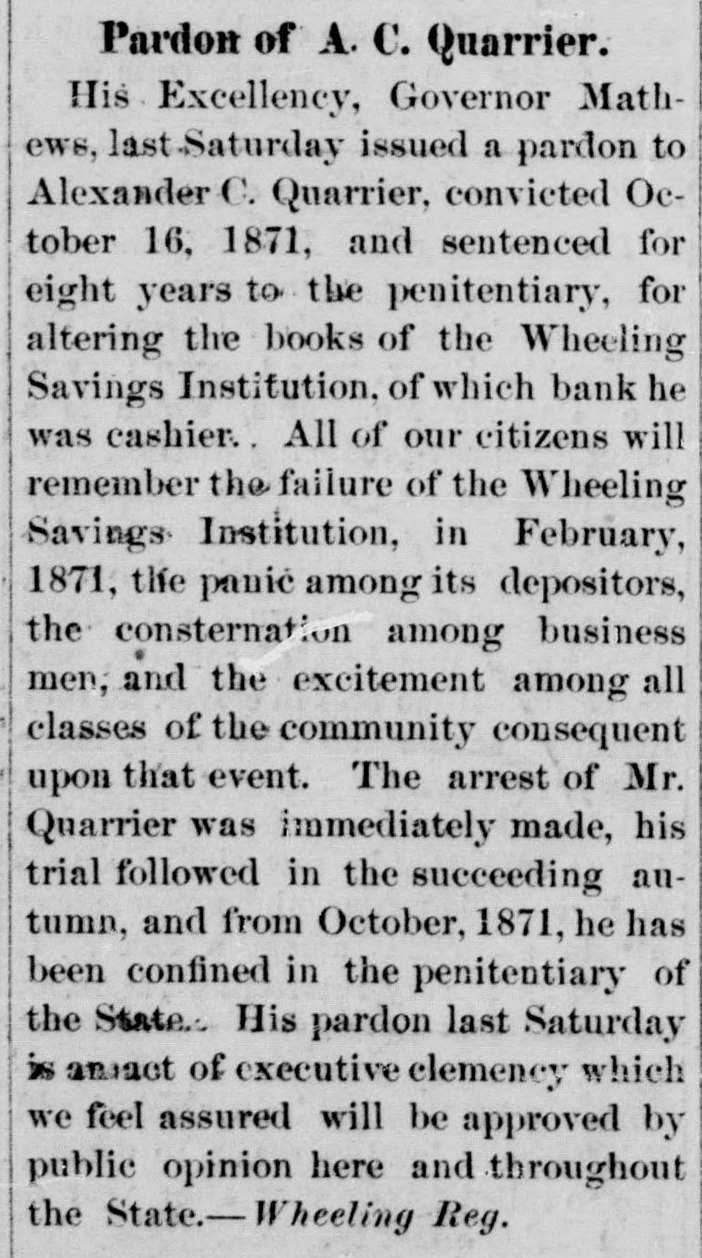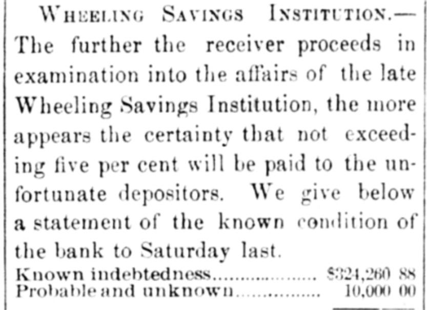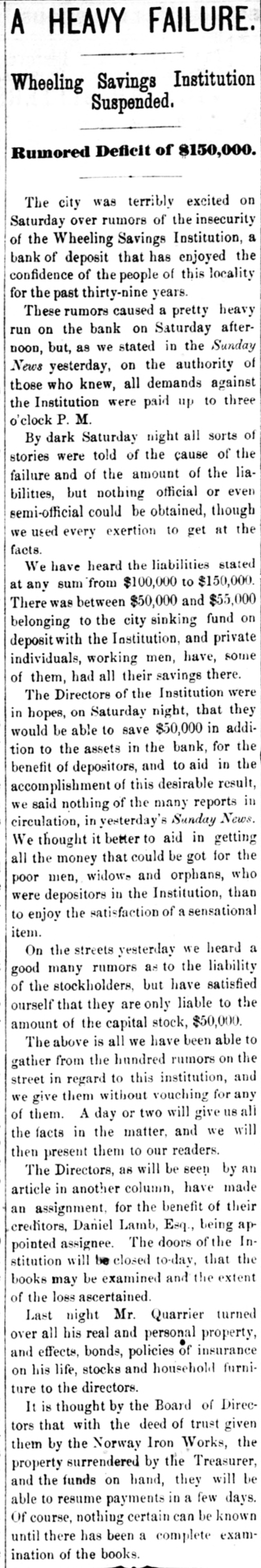 A HEAVY FAILURE. Wheeling Savings Institution Suspended. Rumored Deficit of 8150,000. The city was terribly excited on Saturday over rumors of the insecurity a of the Wheeling Savings Institution, bank of deposit that has enjoyed the confidence of the people of this locality for the past thirty-nine years. These rumors caused a pretty heavy run on the bank on Saturday afternoon, but, as we stated in the Sunday News yesterday, on the authority of those who knew, all demands against the Institution were paid up to three o'clock P. M. By dark Saturday night all sorts of stories were told of the cause of the failure and of the amount of the liabilities, but nothing official or even semi-official could be obtained, though we used every exertion to get at the facts. We have heard the liabilities stated at any sum from $100,000 to $150,000. There was between $50,000 and $55,000 belonging to the city sinking fund on deposit with the Institution, and private individuals, working men, have, some of them, had all their savings there. The Directors of the Institution were in hopes, on Saturday night, that they would be able to save $50,000 in addition to the assets in the bank, for the benefit of depositors, and to aid in the accomplishment of this desirable result, we said nothing of the many reports in circulation, in yesterday's Sunday News. We thought it better to aid in getting all the money that could be got for the poor men, widows and orphans, who were depositors in the Institution, than to enjoy the satisfaction of a sensational item. On the streets yesterday we heard a good many rumors as to the liability of the stockholders but have satisfied ourself that they are only liable to the amount of the capital stock, $50,000. The above is all we have been able to gather from the hundred rumors on the street in regard to this institution, and we them any give without vouching for of them. A day or two will give us all the facts in the matter, and we will then present them to our readers. The Directors, as will be seen by an article in another column, have made an assignment, for the benefit of their creditors, Daniel Lamb, Esq., being ap pointed assignee. The doors of the Institution will be closed to-day, that the books may be examined and the extent of the loss ascertained Last night Mr. Quarrier turned over all his real and personal property, and effects, bonds, policies of insurance on his life, stocks and household furniture to the directors. It is thought by the Board of Directors that with the deed of trust given them by the Norway Iron Works, the property surrendered by the Treasurer, and the funds on hand, they will be able to resume payments in a few days. Of course, nothing certain can be known until there has been a complete examination of the books.