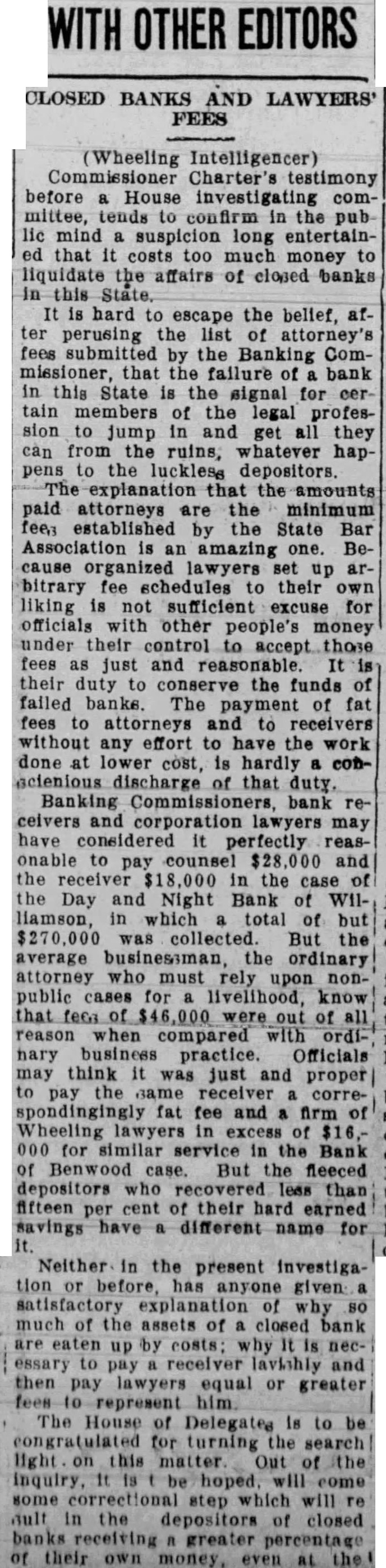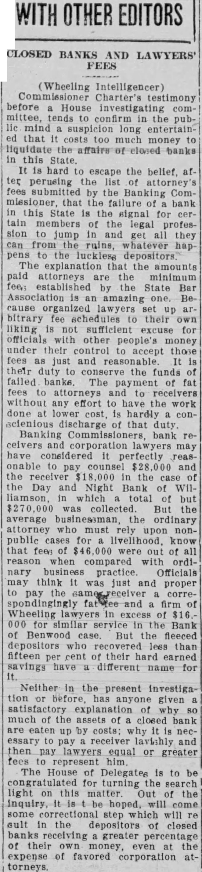 WITH OTHER EDITORS CLOSED BANKS AND LAWYERS' FEES (Wheeling Intelligencer) Commissioner Charter's testimony before House investigating committee, tends to confirm in the pub lic mind suspicion long entertained that it costs too much money to liquidate the affairs of closed banks in this It hard to escape the belief. after perusing the list of attorney's fees submitted by the Banking Commissioner, that the failure of bank in this State is the signal for cer. tain members of the legal profession to jump in and get all they can from the ruins, whatever happens to the luckless depositors explanation that the amounts paid attorneys are the minimum fee,3 established the State Bar Association is an amazing one. Because lawyers set up arbitrary fee schedules to their own liking is not sufficient excuse for officials other people's money under their control to accept those fees as just and reasonable It their duty the funds of failed banks. The payment of fat fees attorneys and to receivers without any effort to have the work done at lower cost, is hardly conscienious discharge of that duty. Banking Commissioners bank receivers and corporation lawyers may have considered perfectly reasonable to pay counsel and the receiver in the case of the Day and Night Bank of Williamson, in which total of but $270,000 was collected But the average businessman, the ordinary attorney who must rely upon nonpublic cases for livelihood, know that were out of reason when compared with ordihary business practice. Officials may think it was just and proper to pay the correspondingingly fat fee and firm of Wheeling in of $16 000 for similar service in the Bank of Benwood case. But the fleeced depositors who recovered less than fifteen per cent of their hard earned savings have different name for it. Neither in the present investiga tion or before has anyone given satisfactory explanation why so much of the assets of closed bank are eaten up by costs why necessary to pay receiver laviahly and then pay lawyers equal or greater fees to represent him The House of Delegates is to be for turning the search light on this matter Out of the is will come some step which will in the depositors of closed banks receiving greater percentage of their own even