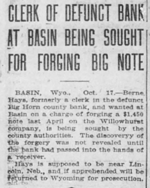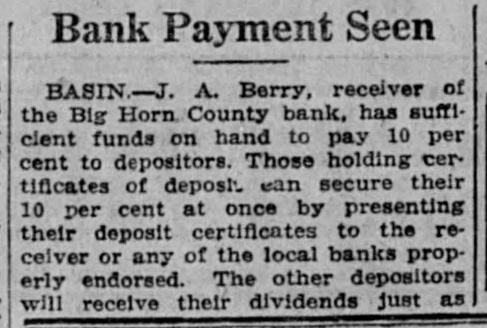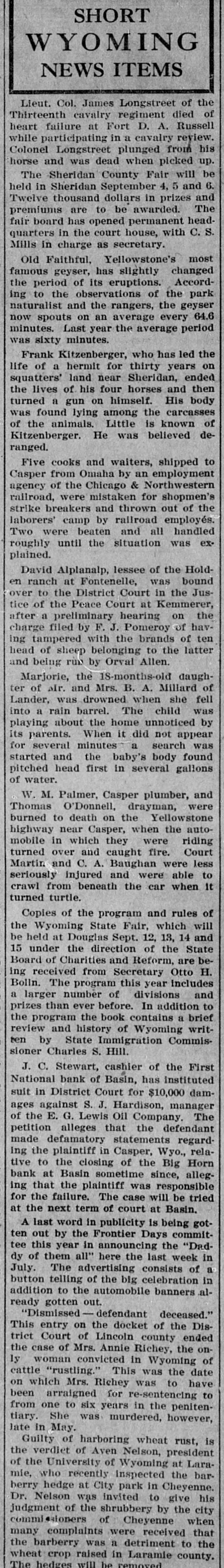 # SHORT WYOMING NEWS ITEMS Lieut. Col. James Longstreet of the Thirteenth cavalry regiment died of heart failure at Fort D. A. Russell while participating in a cavalry review. Colonel Longstreet plunged from his horse and was dead when picked up. The Sheridan County Fair will be held in Sheridan September 4, 5 and 6. Twelve thousand dollars in prizes and premiums are to be awarded. The fair board has opened permanent headquarters in the court house, with C. S. Mills in charge as secretary. Old Faithful, Yellowstone's most famous geyser, has slightly changed the period of its eruptions. According to the observations of the park naturalist and the rangers, the geyser now spouts on an average every 64.6 minutes. Last year the average period was sixty minutes. Frank Kitzenberger, who has led the life of a hermit for thirty years on squatters' land near Sheridan, ended the lives of his four horses and then turned a gun on himself. His body was found lying among the carcasses of the animals. Little is known of Kitzenberger. He was believed deranged. Five cooks and waiters, shipped to Casper from Omaha by an employment agency of the Chicago & Northwestern railroad, were mistaken for shopmen's strike breakers and thrown out of the laborers' camp by railroad employés. Two were beaten and all handled roughly until the situation was explained. David Alplanalp, lessee of the Holden ranch at Fontenelle, was bound over to the District Court in the Justice of the Peace Court at Kemmerer, after a preliminary hearing on the charge filed by F. J. Pomeroy of having tampered with the brands of ten head of sheep belonging to the latter and being run by Orval Allen. Marjorie, the 18-months-old daughter of air. and Mrs. B. A. Millard of Lander, was drowned when she fell into a rain barrel. The child was playing about the home unnoticed by its parents. When it did not appear for several minutes a search was started and the baby's body found pitched head first in several gallons of water. W. M. Palmer, Casper plumber, and Thomas O'Donnell, drayman, were burned to death on the Yellowstone highway near Casper, when the automobile in which they were riding turned over and caught fire. Court Martin and C. A. Baughan were less seriously injured and were able to crawl from beneath the car when it turned turtle. Copies of the program and rules of the Wyoming State Fair, which will be held at Douglas Sept. 12, 13, 14 and 15 under the direction of the State Board of Charities and Reform, are being received from Secretary Otto H. Bolln. The program this year Includes a larger number of divisions and prizes than ever before. In addition to the program the book contains a brief review and history of Wyoming written by State Immigration Commissioner Charles S. Hill. J. C. Stewart, cashier of the First National bank of Basin, has instituted suit in District Court for $10,000 damages against S. J. Hardison, manager of the E. G. Lewis Oil Company. The petition alleges that the defendant made defamatory statements regarding the plaintiff in Casper, Wyo., relative to the closing of the Big Horn bank at Basin sometime since, alleging that the plaintiff was responsible for the failure. The case will be tried at the next term of court at Basin. A last word in publicity is being gotten out by the Frontier Days committee this year in announcing the "Daddy of them all" here the last week in July. The advertising consists of a button telling of the big celebration in addition to the automobile banners already gotten out. "Dismissed-defendant deceased." This entry on the docket of the District Court of Lincoln county ended the case of Mrs. Annie Richey, the only woman convicted in Wyoming of cattle "rustling." This was the date on which Mrs. Richey was to have been arraigned for re-sentencing to from one to six years in the penitentiary. She was murdered, however, late in May. Guilty of harboring wheat rust, is the verdict of Aven Nelson, president of the University of Wyoming at Laramie, who recently inspected the barberry hedge at City park in Cheyenne. Dr. Nelson was invited to give his judgment of the shrubbery by the city commisioners of Cheyenne when many complaints were received that the barberry was a detriment to the wheat crop raised in Laramie county. The hedges will be removed