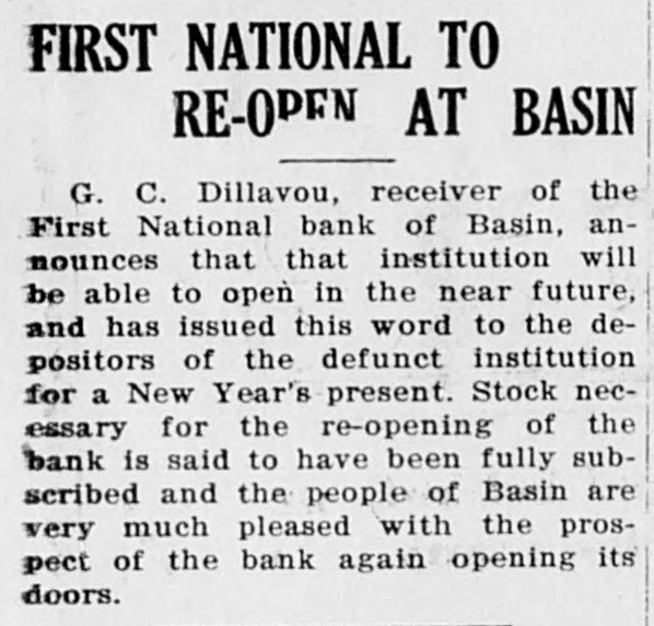 FIRST NATIONAL TO RE-OPEN AT BASIN G. C. Dillavou, receiver of the First National bank of Basin, announces that that institution will be able to open in the near future, and has issued this word to the depositors of the defunct institution for a New Year's present. Stock necessary for the re-opening of the bank is said to have been fully subscribed and the people of Basin are very much pleased with the prospect of the bank again opening its doors.