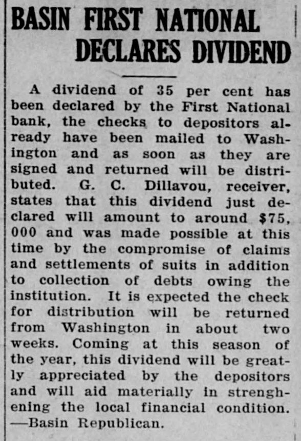 BASIN FIRST NATIONAL DECLARES DIVIDEND A dividend of 35 per cent has been declared by the First National bank, the checks to depositors already have been mailed to Washington and as soon as they are signed and returned will be distributed. G. C. Dillavou, receiver, states that this dividend just declared will amount to around $75, 000 and was made possible at this time by the compromise of claims and settlements of suits in addition to collection of debts owing the institution. It is expected the check for distribution will be returned from Washington in about two weeks. Coming at this season of the year, this dividend will be greatly appreciated by the depositors and will aid materially in strenghening the local financial condition. -Basin Republican.