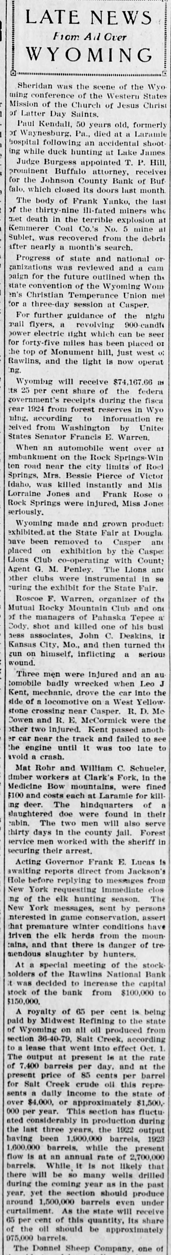 Roscoe F. Warren, organizer of the Mutual Rocky Mountain Club and one of the managers of Pahaska Tepee at Cody, shot and killed one of his business associates, John C. Deskins, in Kansas City, Mo., and then turned the gun on himself, inflicting a serious wound.