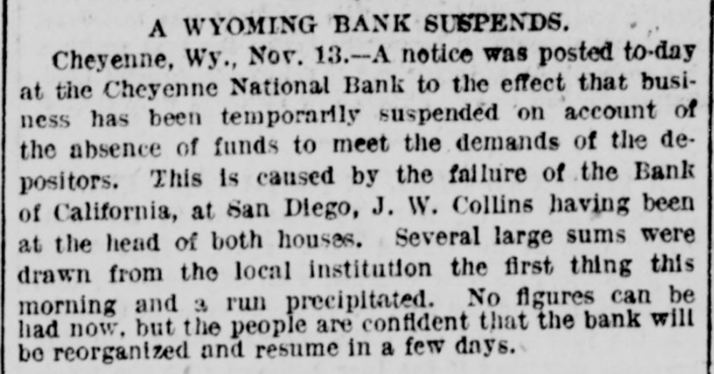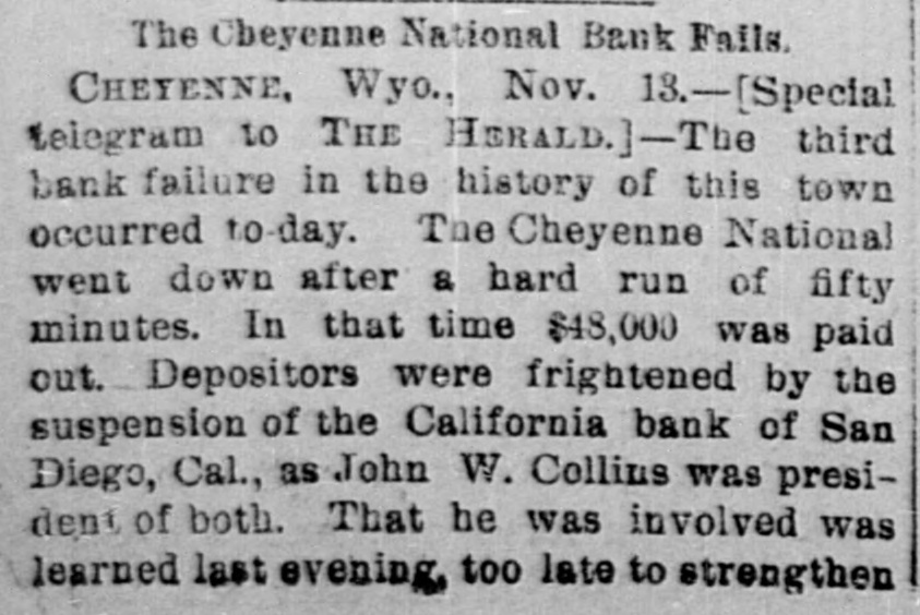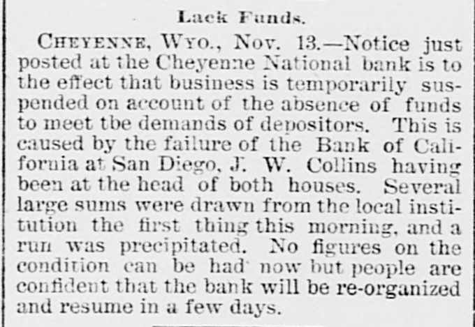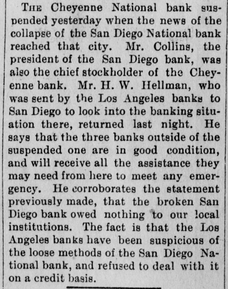 THE Cheyenne National bank suspended yesterday when the news of the collapse of the San Diego National bank reached that city. Mr. Collins, the president of the San Diego bank, was also the chief stockholder of the Cheyenne bank. Mr. H. W. Hellman, who was sent by the Los Angeles banks to San Diego to look into the banking situation there, returned last night. He says that the three banks outside of the suspended one are in good condition, and will receive all the assistance they may need from here to meet any emergency. He corroborates the statement previously made, that the broken San Diego bank owed nothing to our local institutions. The fact is that the Los Angeles banks have been suspicious of the loose methods of the San Diego National bank, and refused to deal with it on a credit basis.