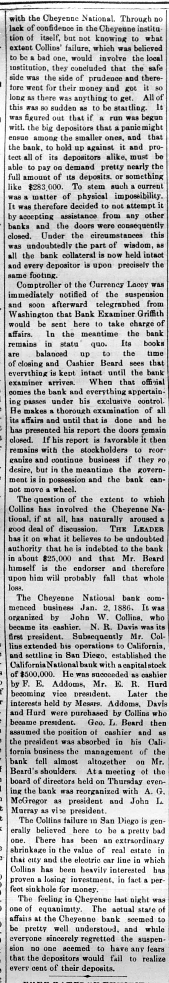 with the Cheyenne National. Through no lack of confidence in the Cheyenne institution of itself, but not knowing to what extent Collins' failure, which was believed to be a bad one, would involve the local institution, they concluded that the safe side was the side of prudence and therefore went for their money and got it so long as there was anything to get. All of this was so sudden as to be startling. It was figured out that if a run was begun with the big depositors that a panicmight ensue among the smaller ones, and that the bank, to hold up against it and protect all of its depositors alike, must be able to pay on demand pretty nearly the full amount of its deposits. or something like $283,000. To stem such a current was a matter of physical impossibility. It was therefore decided to not attempt it by accepting assistance from any other banks and the doors were consequently closed. Under the circumstances this was undoubtedly the part of wisdom, as all the bank collateral is now held intact and every depositor is upon precisely the same footing. Comptroller of the Currency Lacey was immediately notified of the suspension and soon afterward telegraphed from Washington that Bank Examiner Griffith would be sent here to take charge of affairs. In the meantime the bank remains in statu quo. Its books are balanced up to the time of closing and Cashier Beard sees that everything is kept intact until the bank examiner arrives. When that official comes the bank and everything appertaining passes under his exclusive control. He makes a thorough examination of all its affairs and until that is done and he has presented his report the doors remain closed. If his report is favorable it then remains with the stockholders to reorganize and continue business if they PO desire, but in the meantime the government is in possession and the bank cannot move a wheel. The question of the extent to which Collins has involved the Cheyenne National, if at all, has naturally aroused a good deal of discussion. THE LEADER has it on what it believes to be undoubted authority that he is indebted to the bank in about $25,000 and that Mr. Beard himself is the endorser and therefore upon him will probably fall that whole loss. The Cheyenne National bank commenced business Jan. 2, 1886. It was organized by John W. Collins. who became its cashier. N. R. Davis was its first president. Subsequently Mr. Collins extended his operations to California, and settling in San Diego, established the California National bank with a capital stock of $500,000. He was succeeded as cashier by F. E. Addoms, Mr. E. R. Hurd becoming vice president. Later the interests held by Messrs. Addoms, Davis and Hurd were purchased by Collins who became president. Geo. L. Beard then assumed the position of cashier and as the president was absorbed in his California business the management of the bank fell almost altogether on Mr. Beard's shoulders. At a meeting of the board of directors held on Thursday evening the bank was reorganized with A. G. McGregor as president and John L. Murray as vice president. The Collins failure in San Diego is generally believed here to be a pretty bad one. There has been an extraordinary shrinkage in the value of real estate in that city and the electric car line in which Collins has been heavily interested has proven a losing investment, in fact a perfect sinkhole for money. The feeling in Cheyenne last night was one of equanimity. The actual state of affairs at the Cheyenne bank seemed to be pretty well understood, and while everyone sincerely regretted the suspension no one seemed to have any fears that the depositors would fail to realize every cent of their deposits.