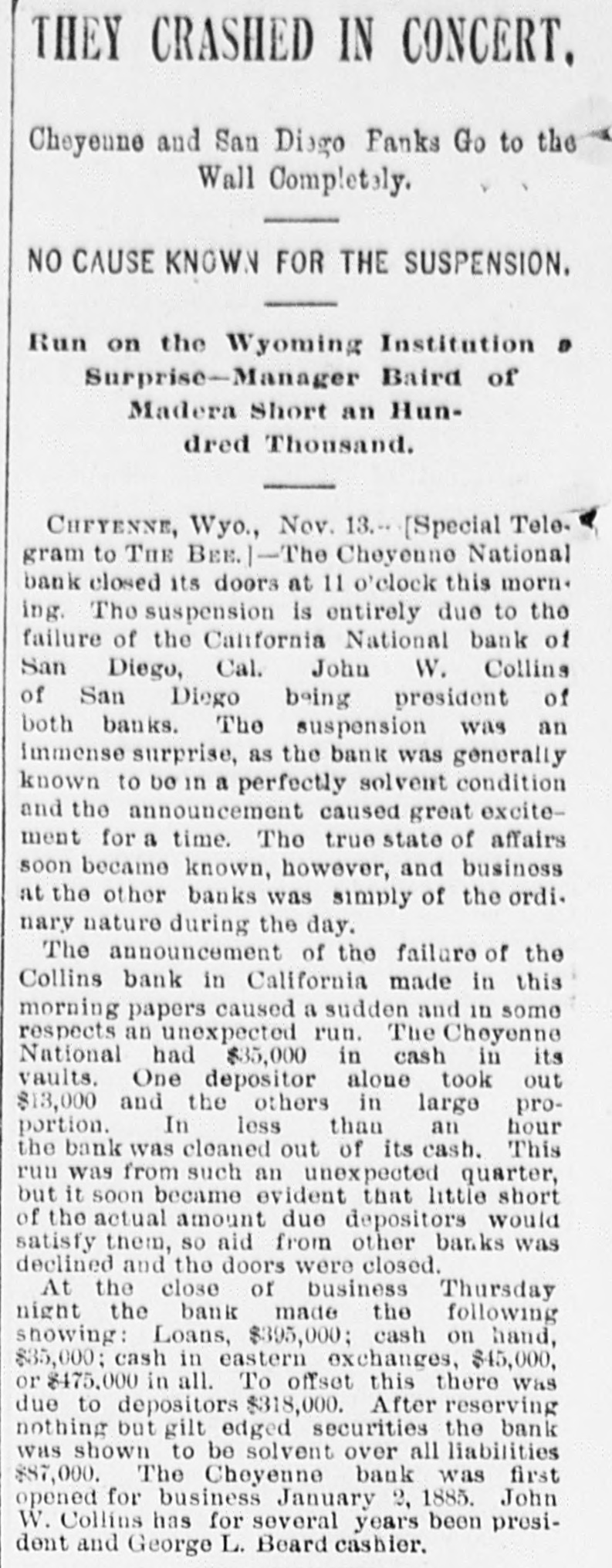 THEY CRASHED IN CONCERT. Cheyenne and San Diago Fanks Go to the Wall Completely. NO CAUSE KNOWN FOR THE SUSPENSION. Run on the Wyoming Institution a Surprise-Manager Baird of Madera Short an Hundred Thousand. CHFYENNE, Wyo., Nov. 13.-- [Special Telegram to THE BEE.]-The Cheyenne National bank closed its doors at 11 o'clock this morning. The suspension is entirely due to the failure of the California National bank of San Diego, Cal. John W. Collins of San Diego being president of both banks. The suspension was an immense surprise, as the bank was generally known to be in a perfectly solvent condition and the announcement caused great excitement for a time. The true state of affairs soon became known, however, and business at the other banks was simply of the ordi. nary nature during the day. The announcement of the failure of the Collins bank in California made in this morning papers caused a sudden and in some respects an unexpected run. The Cheyenne National had $35,000 in cash in its vaults. One depositor alone took out $13,000 and the others in large proportion. In less than an hour the bank was cleaned out of its cash. This run was from such an unexpected quarter, but it soon became evident that little short of the actual amount due depositors would satisfy them, so aid from other banks was declined and the doors were closed. At the close of business Thursday night the bank made the following showing: Loans, $395,000; cash on hand, $35,000; cash in eastern exchanges, $45,000, or $475,000 in all. To offset this there was due to depositors $318,000. After reserving nothing but gilt edged securities the bank was shown to be solvent over all liabilities $87,000. The Cheyenne bank was first opened for business January 2, 1885. John W. Collins has for several years been president and George L. Beard cashier.