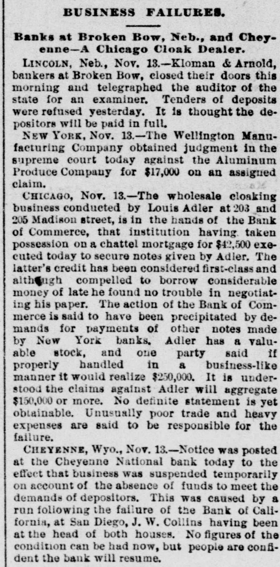 BUSINESS FAILURES. Banks at Broken Bow, Neb., and Cheyenne-A Chicago Cloak Dealer. LINCOLN, Neb., Nov. 13.-Kloman & Arnold, bankers at Broken Bow, closed their doors this morning and telegraphed the auditor of the state for an examiner. Tenders of deposits were refused yesterday. It is thought the depositors will be paid in full. NEW YORK, Nov. 13.-The Wellington Manufacturing Company obtained judgment in the supreme court today against the Aluminum Produce Company for $17,000 on an assigned claim. CHICAGO, Nov. 13.-The wholesale cloaking business conducted by Louis Adler at 203 and 205 Madison street, is in the hands of the Bank of Commerce, that institution having taken possession on a chattel mortgage for $42,500 executed today to secure notes given by Adler. The latter's credit has been considered first-class and although compelled to borrow considerable money of late he found no trouble in negotiating his paper. The action of the Bank of Commerce is said to have been precipitated by demands for payments of other notes made by New York banks. Adler has a valuable stock, and one party said if properly handled in a business-like manner it would realize $250,000. It is understood the claims against Adler will aggregate $150,000 or more. No definite statement is yet obtainable. Unusually poor trade and heavy expenses are said to be responsible for the failure. CHEYENNE, Wyo., Nov. 13.-Notice was posted at the Cheyenne National bank today to the effect that business was suspended temporarily on account of the absence of funds to meet the demands of depositors. This was caused by a run following the failure of the Bank of California, at San Diego, J. W. Collins having been at the head of both houses. No figures of the condition can be had now, but people are confident the bank will resume.