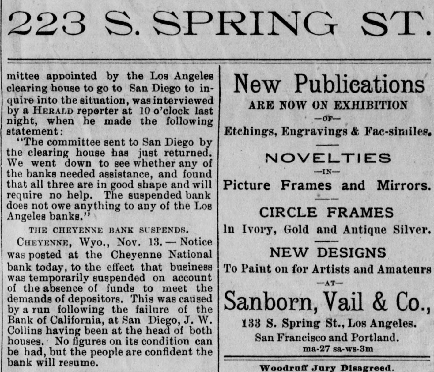 223 S. SPRING ST. mittee appointed by the Los Angeles New Publications clearing house to go to San Diego to inquire into the situation, was interviewed ARE NOW ON EXHIBITION by a HERALD reporter at 10 o'clock last -OFnight, when he made the following statement: Etchings, Engravings & Fac-siniles. "The committee sent to San Diego by the clearing house has just returned. NOVELTIES We went down to see whether any of -INthe banks needed assistance, and found Picture Frames and Mirrors. that all three are in good shape and will require no help. The suspended bank does not owe anything to any of the Los CIRCLE FRAMES Angeles banks." THE CHEYENNE BANK SUSPENDS. In Ivory, Gold and Antique Silver. CHEYENNE, Wyo., Nov. 13. - Notice NEW DESIGNS was posted at the Cheyenne National bank today, to the effect that business To Paint on for Artists and Amateurs was temporarily suspended on account -ATof the absence of funds to meet the demands of depositors. This was caused Sanborn, Vail & Co., by a run following the failure of the Bank of California, at San Diego, J. W. 133 S. Spring St., Los Angeles. Collins having been at the head of both San Francisco and Portland. houses. No figures on its condition can ma-27 sa-ws-3m be had, but the people are confident the bank will resume. Woodruff Jury Disagreed.