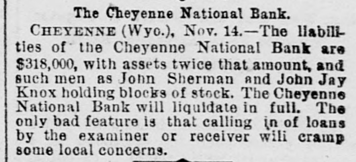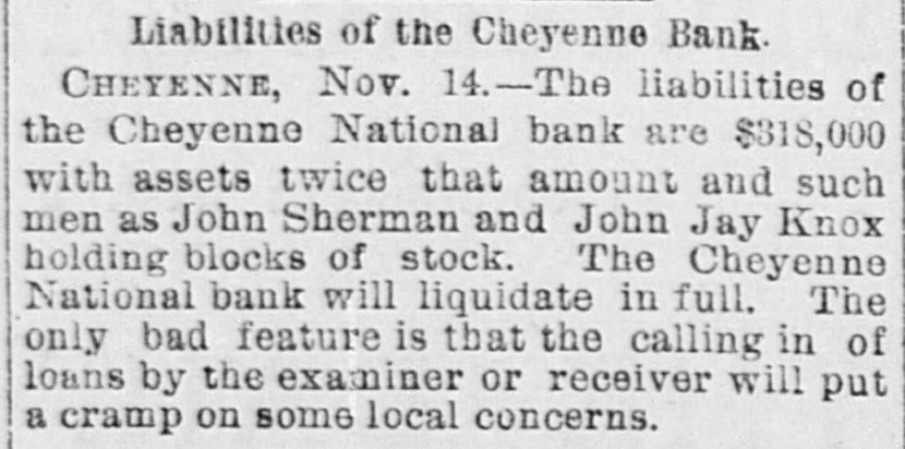 Liabilities of the Cheyenne Bank. CHEYENNE, Nov. 14.-The liabilities of the Cheyenne National bank are $318,000 with assets twice that amount and such men as John Sherman and John Jay Knox holding blocks of stock. The Cheyenne National bank will liquidate in full. The only bad feature is that the calling in of loans by the examiner or receiver will put a cramp on some local concerns.
