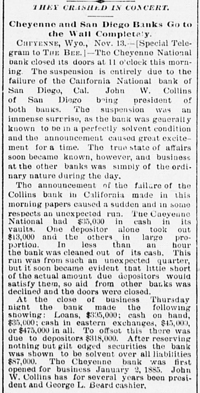 THEY CRASHED IN CONCERT. Cheyenne and San Diego Banks Go to the Wall Completely. CHTYENNE, Wyo., Nov. 13.-[Special Telegram to THE BEE.]-The Cheyenne National bank closed its doors at 11 o'clock this morning. The suspension is entirely due to the failure of the California National bank of San Diego, Cal. John W. Collins of San Diego being president of both banks. The suspension was an immense surprise, as the bank was generally known to be in a perfectly solvent condition and the announcement caused great excitement for a time. The true state of affairs soon became known, however, and business at the other banks was simply of the ordinary nature during the day. The announcement of the failure of the Collins bank in California made in this morning papers caused a sudden and in some respects an unexpected run. The Cheyenne National had $35,000 in cash in its vaults. One depositor alone took out $13,000 and the others in large proportion. In less than an hour the bank was cleaned out of its cash. This run was from such an unexpected quarter, but it soon became evident that little short of the actual amount due depositors would satisfy them, so aid from other banks was declined and the doors were closed. At the close of business Thursday night the bank made the following showing: Loans, $335,000; cash on hand, $35,000; cash in eastern exchanges, $45,000, or $475,000 in all. To offset this there was due to depositors $318,000. After reserving nothing but gilt edged securities the bank was shown to be solvent over all liabilities $87,000. The Cheyenne bank was first opened for business January 2, 1885. John W. Collins has for several years been president and George L. Beard cashier,