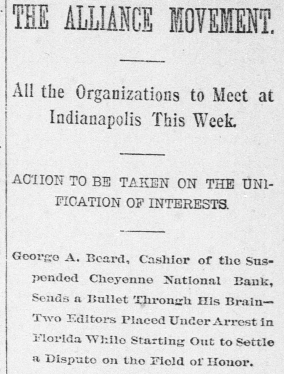 THE ALLIANCE MOVEMENT. All the Organizations to Meet at Indianapolis This Week. ACTION TO BE TAKEN ON THE UNIFICATION OF INTERESTS George A. Board, Cashier of the Suspended Cheyenne National Bank, Sends a Bullet Throngh His BrainTwo Editors Placed Under Arrest in Florida While Starting Out to Settle a Dispute on the Field of Honor.