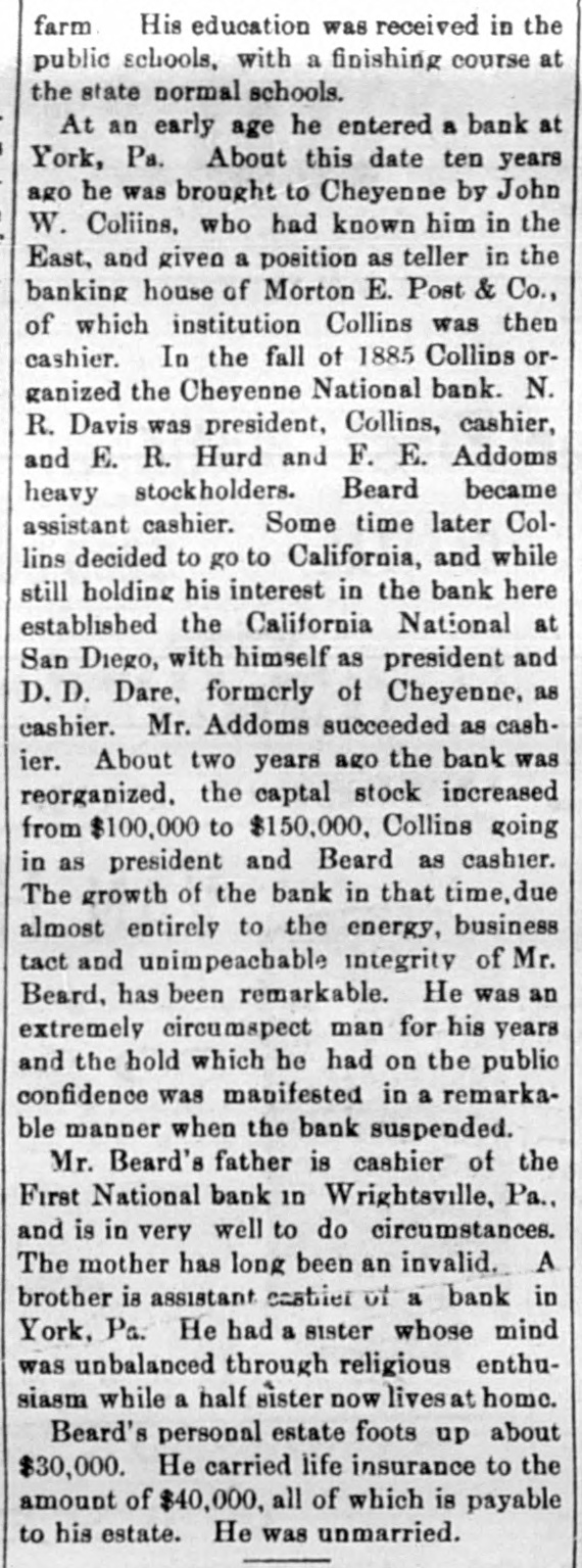 At an early age he entered a bank at York, Pa. About this date ten years ago he was brought to Cheyenne by John W. Coliins, who had known him in the East, and given a position as teller in the banking house of Morton E. Post & Co., of which institution Collins was then cashier. In the fall of 1885 Collins organized the Cheyenne National bank. N. R. Davis was president, Collins, cashier, and E. R. Hurd and F. E. Addoms heavy stockholders. Beard became assistant cashier. Some time later Collins decided to go to California, and while still holding his interest in the bank here established the California National at San Diego, with himself as president and D. D. Dare, formerly of Cheyenne, as cashier. Mr. Addoms succeeded as cashier. About two years ago the bank was reorganized, the captal stock increased from $100,000 to $150,000, Collins going in as president and Beard as cashier. The growth of the bank in that time, due almost entirely to the energy, business tact and unimpeachable integrity of Mr. Beard, has been remarkable. He was an extremely circumspect man for his years and the hold which he had on the public confidence was manifested in a remarkable manner when the bank suspended.