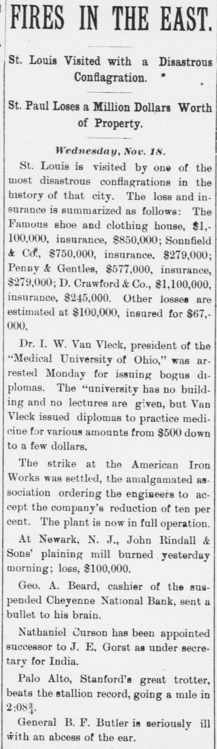 FIRES IN THE EAST. St. Louis Visited with a Disastrous Conflagration. St. Paul Loses a Million Dollars Worth of Property. Wednesday, Nov. 18. St. Louis is visited by one of the most disastrous conflagrations in the history of that city. The loss and insurance is summarized as follows: The Famous shoe and clothing house, $1,100,000, insurance, $850,000; Sonnfield & Co., $750,000, insurance, $279,000; Penny & Gentles, $577,000, insurance, $279,000; D. Crawford & Co., $1,100,000, insurance, $245,000. Other losses are estimated at $100,000, insured for $67,000, Dr. I. W. Van Vleck, president of the "Medical University of Ohio," was arrested Monday for issuing bogus diplomas. The "university has no building and no lectures are given, but Van Vleck issued diplomas to practice medicine for various amounts from $500 down to a few dollars. The strike at the American Iron Works was settled, the amalgamated association ordering the engineers to accept the company's reduction of ten per cent. The plant is now in full operation. At Newark, N. J., John Rindall & Sons' plaining mill burned yesterday morning; loss, $100,000. Geo. A. Beard, cashier of the suspended Cheyenne National Bank, sent a bullet to his brain. Nathaniel Curson has been appointed successor to J. E, Gorst as under secretary for India. Palo Alto, Stanford's great trotter, beats the stallion record, going a mile in 2:08 3. General B. F. Butler is seriously ill with an abcess of the ear.