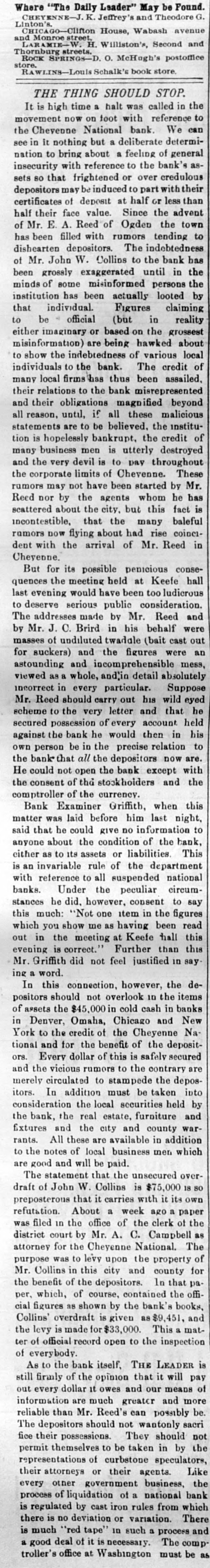 here "The Daily Leader" May be Found. CHEYENNE-J. K. Jeffrey's and Theodore G. nton's. CHICAGO-Clifton House, Wabash avenue d Monroe street. ARAMIE-W. H. Williston's, Second and ornburg streets. ROCK SPRINGS-D. O. McHugh's postoffice *9.10 RAWLINS-Louis Schalk's book store. THE THING SHOULD STOP. It is high time a halt was called in the ovement now on foot with reference to el Chevenne National bank. We can el in it nothing but a deliberate determition to bring about a feeling of general security with reference to the bank's asts 80 that frightened or over credulous positors may be induced to part with their rtificates of deposit at half or less than If their face value. Since the advent Mr. E. A. Reed of Ogden the town s been filled with rumors tending to shearten depositors. The indebtedness Mr. John W. Collins to the bank has en grossly exaggerated until in the nds of some misinformed persons the titution has been actually looted by children Rightes Tenpisipal at be official (but in reality her imaginary or based on the grossest sinformation) are being hawked about show the indebtedness of various local lividuals to the bank. The credit of ny local firms has thus been assailed, eir relations to the bank misrepresented a their obligations magnified beyond reason, until, if all these malicious tements are to be believed. the instituni is hopelessly bankrupt, the credit of ny business men is utterly destroyed d the very devil is to pay throughout , corporate limits of Chevenne. These nors may not have been started by Mr. ed nor by the agents whom he has attered about the city, but this fact is ontestible, that the many baleful mors now flying about had rise coincint with the arrival of Mr. Reed in eyenne. But for its possible penicious conseences the meeting held at Keefe hall t evening would have been too ludicrous deserve serious public consideration. e addresses made by Mr. Reed and Mr. J. C. Brird in his behalf were asses of undiluted twaddle (bait cast out r suckers) and the figures were an tounding and incomprehensible mess, ewed as a whole, and,in detail absolutely correct in every particular. Suppose r. Reed should carry out his wild eyed heme to the very letter and that he cured possession of every account held ainst the bank he would then in his n person be in the precise relation to el bank* that all the depositors now are. e could not open the bank except with a consent of thd stockholders and the nptroller of the currency. Bank Examiner Griffith, when this tter was laid before him last night, d that he could give no information to yone about the condition of the bank, her as to its assets or liabilities. This an invariable rule of the department th reference to all suspended national nks. Under the peculiar circuminces he did, however, consent to say is much: "Not one item in the figures ich you show me as having been read t in the meeting at Keefe hall this ening is correct." Further than this r. Griffith did not feel justified in say-