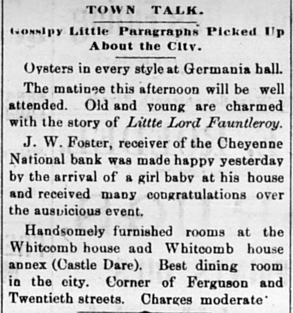 TOWN TALK. Gossipy Little Paragraphs Picked Up About the City. Oysters in every style at Germania hall. The matinee this afternoon will be well attended. Old and young are charmed with the story of Littte Lord Fauntleroy. J. W. Foster, receiver of the Cheyenne National bank was made happy yesterday by the arrival of a girl baby at his house and received many congratulations over the auspicious event. Handsomely furnished rooms at the Whitcomb house and Whitcomb house annex (Castle Dare). Best dining room in the city. Corner of Ferguson and Twentieth streets. Charges moderate'