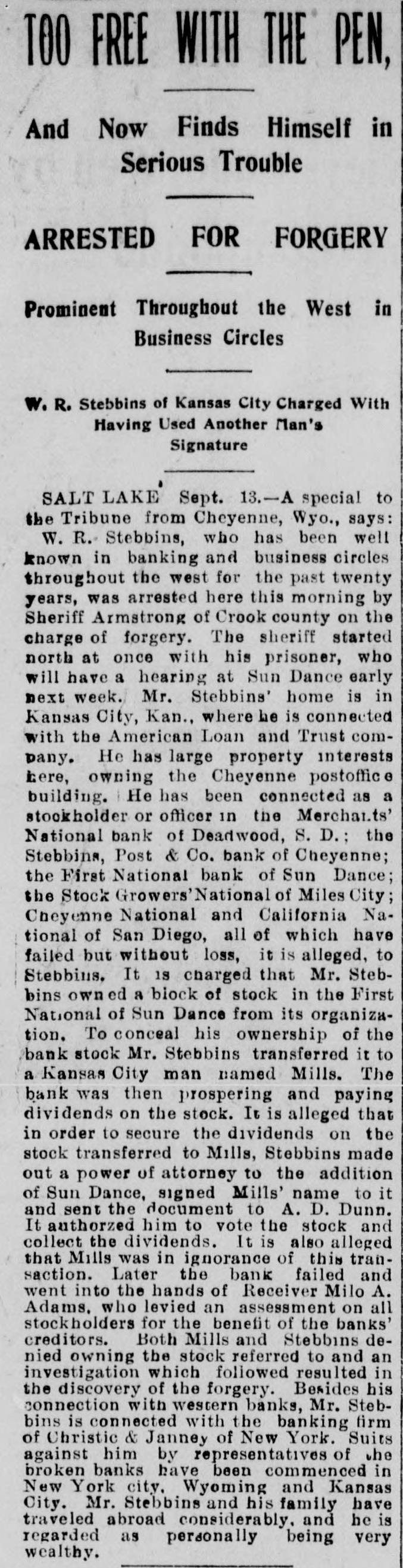 TOO FREE WITH THE PEN, And Now Finds Himself in Serious Trouble FOR ARRESTED FORGERY Prominent Throughout the West in Business Circles w. R. Stebbins of Kansas City Charged With Having Used Another Man's Signature SALT LAKE Sept. 13.-A special to the Tribune from Cheyenne, Wyo., says: W. R. Stebbins, who has been well known in banking and business circles throughout the west for the past twenty years, was arrested here this morning by Sheriff Armstrong of Crook county on the charge of forgery. The sheriff started north at once with his prisoner, who will have a hearing at Sun Dance early next week. Mr. Stebbins' home is in Kansas City, Kan., where he is connected with the American Loan and Trust comDany. He has large property interests here, owning the Cheyenne postoffic e building. He has been connected as a stockholder or officer in the Merchants' National bank of Deadwood, S. D.: the Stebbins, Post & Co. bank of Cheyenne; the First National bank of Sun Dance; the Stock Growers National of Miles City; Cheyenne National and California National of San Diego, all of which have failed but without loss, it is alleged, to Stebbins. It 18 charged that Mr. Stebbins owne ed a block of stock in the First National of Sun Dance from its organization. To conceal his ownership of the bank stock Mr. Stebbins transferred it to a Kansas City man named Mills. The bank was then prospering and paying dividends on the stock. It is alleged that in order to secure the dividends on the stock transferred to Mills, Stebbins made out a power of attorney to the addition of Sun Dance, signed Mills' name to it and sent the document to A. D. Dunn. It authorzed him to vote the stock and collect the dividends. It is also alleged that Mills was in ignorance of this transaction. Later the bank failed and went into the hands of Receiver Milo A. Adams, who levied an assessment on all stockholders for the benefit of the banks' creditors. Both Mills and Stebbins denied owning the stock referred to and an investigation which followed resulted in the discovery of the forgery. Besides his connection with western banks, Mr. Stebbins is connected with the banking firm of Christic & Janney of New York. Suits against him by representatives of the broken banks have been commenced in New York city. Wyoming and Kansas City. Mr. Stebbins and his family have traveled abroad considerably, and he is regarded as personally being very wealthy.