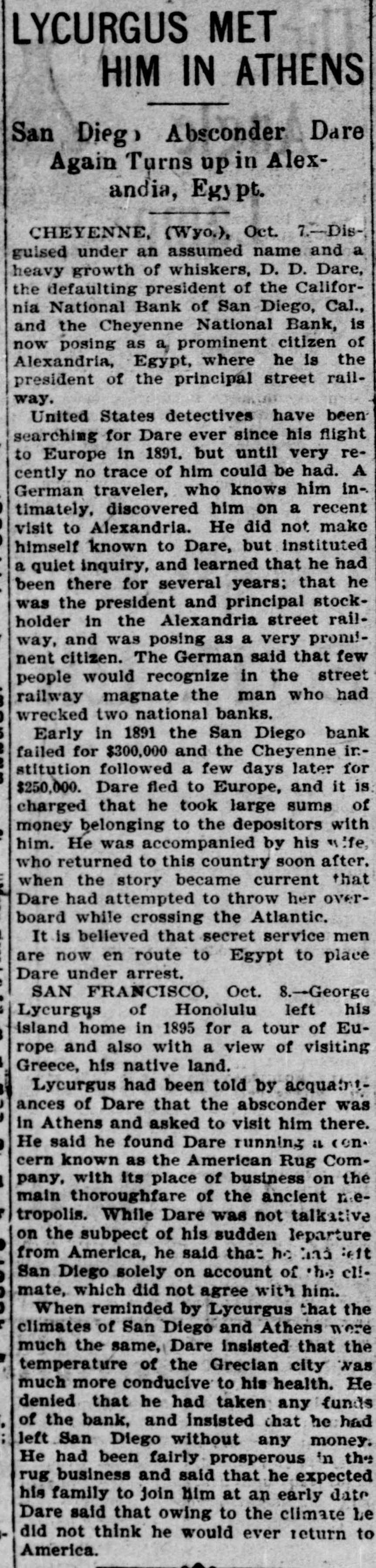 LYCURGUS MET HIM IN ATHENS San Dieg) Absconder Dare Again Turns up in Alexandia, Egypt. CHEYENNE, (Wyo.), Oct. 7.-Disguised under an assumed name and a heavy growth of whiskers, D. D. Dare, the defaulting president of the California National Bank of San Diego, Cal., and the Cheyenne National Bank, is now posing as a prominent citizen of Alexandria, Egypt, where he is the president of the principal street railway. United States detectives have been searching for Dare ever since his flight to Europe in 1891. but until very recently no trace of him could be had. A German traveler, who knows him intimately, discovered him on a recent visit to Alexandria. He did not make himself known to Dare, but instituted a quiet inquiry, and learned that he had been there for several years; that he was the president and principal stockholder in the Alexandria street railway, and was posing as a very prominent citizen. The German said that few people would recognize in the street railway magnate the man who had wrecked two national banks. Early in 1891 the San Diego bank failed for $300,000 and the Cheyenne ir.stitution followed a few days later for $250,000. Dare fled to Europe, and it is charged that he took large sums of money belonging to the depositors with him. He was accompanied by his ife, who returned to this country soon after. when the story became current that Dare had attempted to throw her overboard while crossing the Atlantic. It is believed that secret service men are now en route to Egypt to place Dare under arrest. SAN FRANCISCO, Oct. 8.-George Lycurgys of Honolulu left his island home in 1895 for a tour of Europe and also with a view of visiting Greece, his native land. Lycurgus had been told by acquatrtances of Dare that the absconder was in Athens and asked to visit him there. He said he found Dare running a concern known as the American Rug Company, with its place of business on the main thoroughfare of the ancient n.etropolis. While Dare was not talkative on the subpect of his sudden leparture from America, he said that he had :,1t San Diego solely on account of the climate, which did not agree with him. When reminded by Lycurgus that the climates of San Diego and Athens were much the same, Dare Insisted that the temperature of the Grecian city was much more conducive to his health. He denied that he had taken any funds of the bank, and insisted that he had left San Diego without any money. He had been fairly prosperous in the rug business and said that he expected his family to join him at an early date Dare said that owing to the climate Le did not think he would ever return to America.