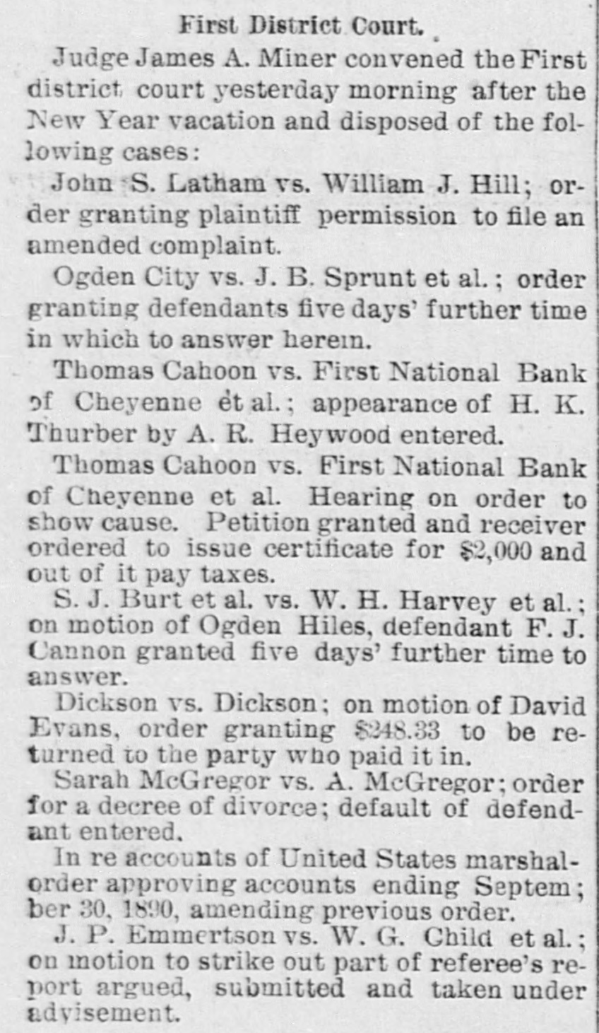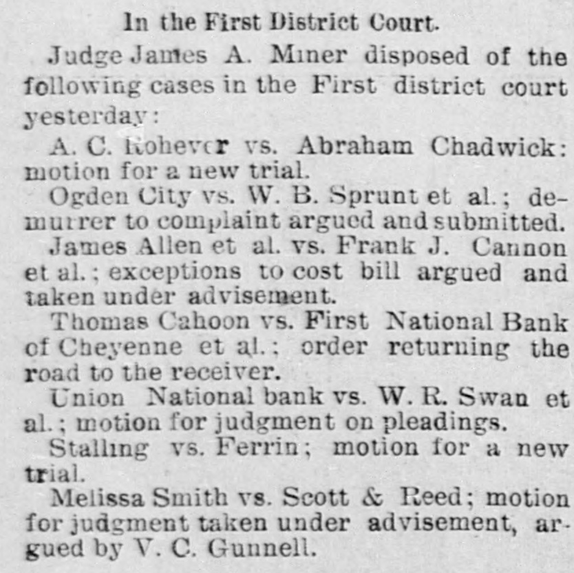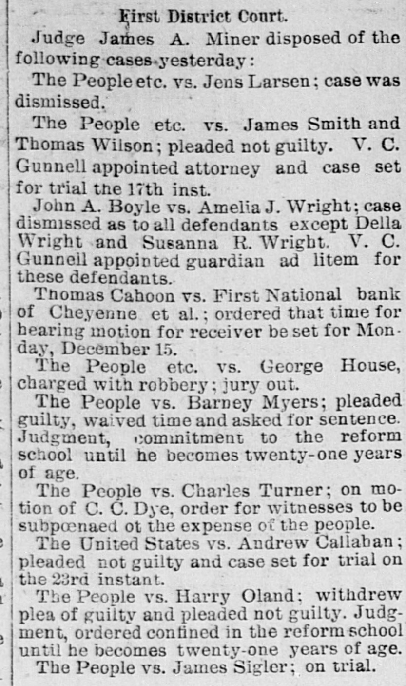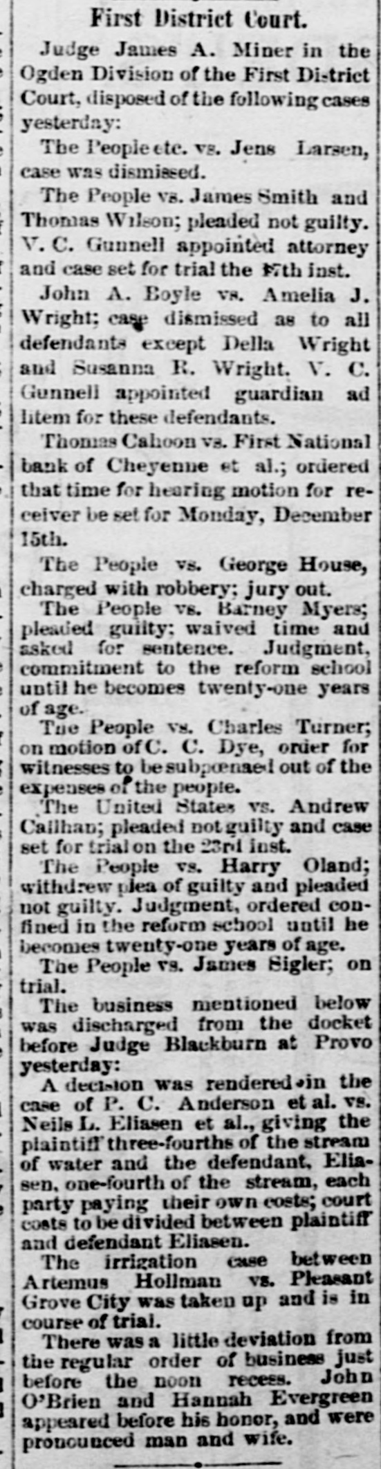 First District Court. Judge James A. Miner in the Ogden Division of the First District Court, disposed of the following cases yesterday: The People ete. VS. Jens Larsen, case was dismissed. The People VS. James Smith and Thomas Wilson; pleaded not guilty. V.C. Gunnell appointed attorney and case set for trial the Fith inst. John A. Boyle VS. Amelia J. Wright; case dismissed as to all defendants except Della Wright and Susanna R. Wright. V. C. Gunnell appointed guardian ad litem for these defendants. Thomas Cahoon V8. First National bank of Cheyenne et al.; ordered that time for hearing motion for receiver be set for Monday, December 15th. The People VS. George House, charged with robbery; jury out. The People VS. Barney Myers; pleaded guilty; waived time and asked for sentence. Judgment, commitment to the reform school until he becomes twenty-one years of age. The People VS. Charles Turner; on motion of C. C. Dye, order for witnesses to besubpoenaed out of the expenses of the people. The United States vs. Andrew Callhan; pleaded not guilty and case set for trial on the 23rd inst. The People vs. Harry Oland; withdrew plea of guilty and pleaded not guilty. Judgment, ordered confined in the reform school until he becomes twenty-one years of age. The People vs. James Sigler; on trial. The business mentioned below was discharged from the docket before Judge Blackburn at Provo yesterday: A decision was rendered in the case of P. C. Anderson et al. vs. Neils L. Eliasen et al., giving the plaintiff three-fourths of the stream of water and the defendant, Eliasen. one-fourth of the stream, each party paying their own costs; court costs to be divided between plaintiff and defendant Eliasen. The irrigation case between Artemus Hollman vs. Pleasant Grove City was taken up and is in course of trial. There was a little deviation from the regular order of business just before the noon recess. John O'Brien and Hannah Evergreen appeared before his honor, and were pronounced man and wife.