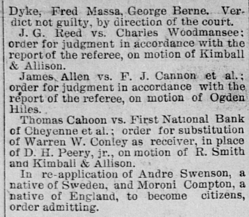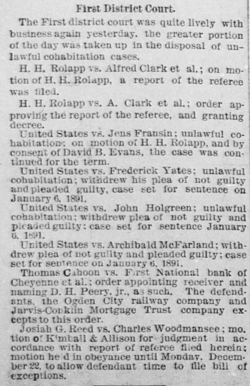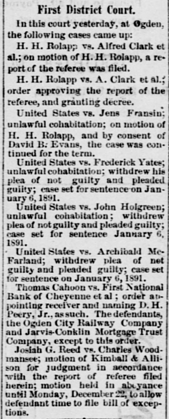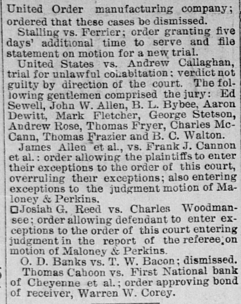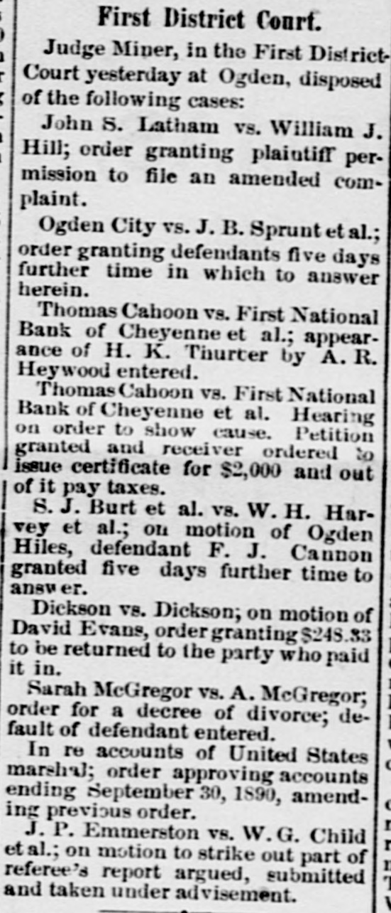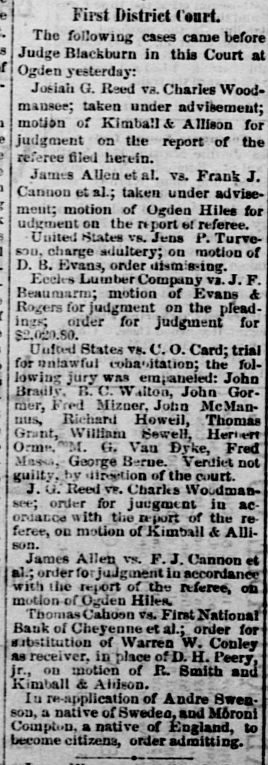 First District Court. Judge James A. Miner in the Ogden Division of the First District Court, disposed of the following cases yesterday: The People ete. VS. Jens Larsen, case was dismissed. The People VS. James Smith and Thomas Wilson; pleaded not guilty. V.C. Gunnell appointed attorney and case set for trial the Fith inst. John A. Boyle VS. Amelia J. Wright; case dismissed as to all defendants except Della Wright and Susanna R. Wright. V. C. Gunnell appointed guardian ad litem for these defendants. Thomas Cahoon V8. First National bank of Cheyenne et al.; ordered that time for hearing motion for receiver be set for Monday, December 15th. The People VS. George House, charged with robbery; jury out. The People VS. Barney Myers; pleaded guilty; waived time and asked for sentence. Judgment, commitment to the reform school until he becomes twenty-one years of age. The People VS. Charles Turner; on motion of C. C. Dye, order for witnesses to besubpoenaed out of the expenses of the people. The United States vs. Andrew Callhan; pleaded not guilty and case set for trial on the 23rd inst. The People vs. Harry Oland; withdrew plea of guilty and pleaded not guilty. Judgment, ordered confined in the reform school until he becomes twenty-one years of age. The People vs. James Sigler; on trial. The business mentioned below was discharged from the docket before Judge Blackburn at Provo yesterday: A decision was rendered in the case of P. C. Anderson et al. vs. Neils L. Eliasen et al., giving the plaintiff three-fourths of the stream of water and the defendant, Eliasen. one-fourth of the stream, each party paying their own costs; court costs to be divided between plaintiff and defendant Eliasen. The irrigation case between Artemus Hollman vs. Pleasant Grove City was taken up and is in course of trial. There was a little deviation from the regular order of business just before the noon recess. John O'Brien and Hannah Evergreen appeared before his honor, and were pronounced man and wife.