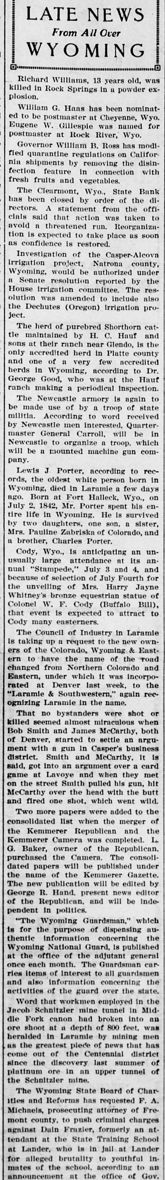 LATE NEWS From All Over WYOMING Richard Williams, 13 years old, was killed in Rock Springs in a powder explosion. William G. Haas has been nominated to be postmaster at Cheyenne, Wyo. Eugene W. Gillespie was named for postmaster at Rock River, Wyo. Governor William B. Ross has modified quarantine regulations on California shipments by removing the disinfection feature in connection with fresh fruits and vegetables. The Clearmont, Wyo., State Bank has been closed by order of the directors. A statement from the officials said that action was taken to avoid a threatened run. Reorganization is expected to take place as soon as confidence is restored. Investigation of the Casper-Alcova irrigation project, Natrona county, Wyoming, would be authorized under a Senate resolution reported by the House irrigation committee. The resolution was amended to include also the Dechutes (Oregon) irrigation project. The herd of purebred Shorthorn cattle maintained by H. C. Hauf and sons at their ranch near Glendo, is the only accredited herd in Platte county and one of a very few accredited herds in Wyoming, according to Dr. George Good, who was at the Hauf ranch making a periodical inspection. The Newcastle armory is again to be made use of by a troop of state militia. According to word received by Newcastle men interested, Quartermaster General Carroll, will be in Newcastle to organize a troop, which will be a mounted machine gun company. Lewis J Porter, according to records, the oldest white person born in Wyoming, died in Laramie a few days ago. Born at Fort Halleck, Wyo., on July 2, 1842, Mr. Porter spent his entire life in Wyoming. He is survived by two daughters, one son, a sister, Mrs. Pauline Zabriska of Colorado, and a brother, Charles Porter. Cody, Wyo., is anticipating an unusually large attendance at its annual "Stampede," July 3 and 4, and because of selection of July Fourth for the unveiling of Mrs. Harry Jayne Whitney's bronze equestrian statue of Colonel W. F. Cody (Buffalo Bill), that event is expected to attract to Cody many easterners. The Council of Industry in Laramie Is taking up a request to the new owners of the Colorado, Wyoming & Eastern to have the name of the road changed from Northern Colorado and Eastern, under which It was incorporated at Denver last week, to the "Laramie & Southwestern," again recognizing Laramie in the name. That no bystanders were shot or killed seemed almost miraculous when Bob Smith and James McCarthy, both of Denver, started to settle an argument with a gun in Casper's business district. Smith and McCarthy, It is said, got into an argument over a card game at Lavoye and when they met on the street Smith pulled his gun, hit McCarthy over the head with the butt and fired one shot, which went wild. Two more papers were added to the consolidated list when the merger of the Kemmerer Republican and the Kemmerer Camera was completed. L. G. Baker, owner of the Republican. purchased the Camera. The consolidated papers will be published under the name of the Kemmerer Gazette. The new publication will be edited by George R. Hand, present news editor of the Republican, and will be independent in politics. "The Wyoming Guardsman," which is for the purpose of dispensing authentic information concerning the Wyoming National Guard, is published at the office of the adjutant general once each month. The Guardsman carries items of Interest to all guardsmen and also information concerning the activities of the guard over the state. Word that workmen employed in the Jacob Schnitzler mine tunnel in Middle Fork canon had broken into an ore shoot at a depth of 800 feet. was