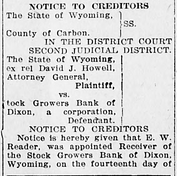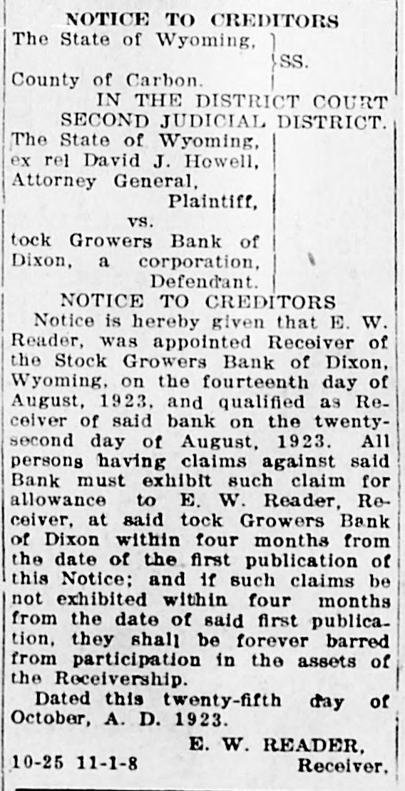NOTICE TO CREDITORS The State of Wyoming, SS. County of Carbon. IN THE DISTRICT COURT SECOND JUDICIAL DISTRICT. The State of Wyoming, ex rel David J. Howell, Attorney General, Plaintiff, vs. tock Growers Bank of Dixon, a corporation, Defendant. NOTICE TO CREDITORS Notice is hereby given that E. W. Reader, was appointed Receiver of the Stock Growers Bank of Dixon, Wyoming, on the fourteenth day of August, 1923, and qualified as Receiver of said bank on the twentysecond day of August, 1923. All persons having claims against said Bank must exhibit such claim for allowance to E. W. Reader, Receiver, at said tock Growers Bank of Dixon within four months from the date of the first publication of this Notice; and if such claims be not exhibited within four months from the date of said first publication, they shall be forever barred from participation in the assets of the Receivership. Dated this twenty-fifth day of October, A. D. 1923. E. W. READER, 10-25 11-1-8 Receiver.