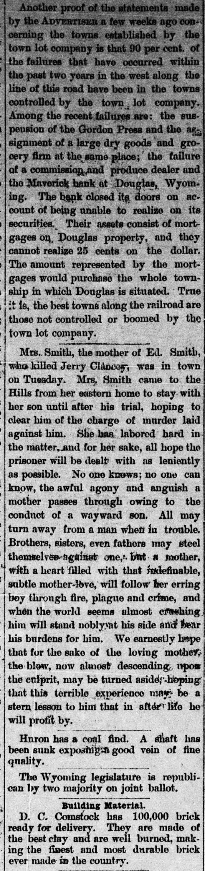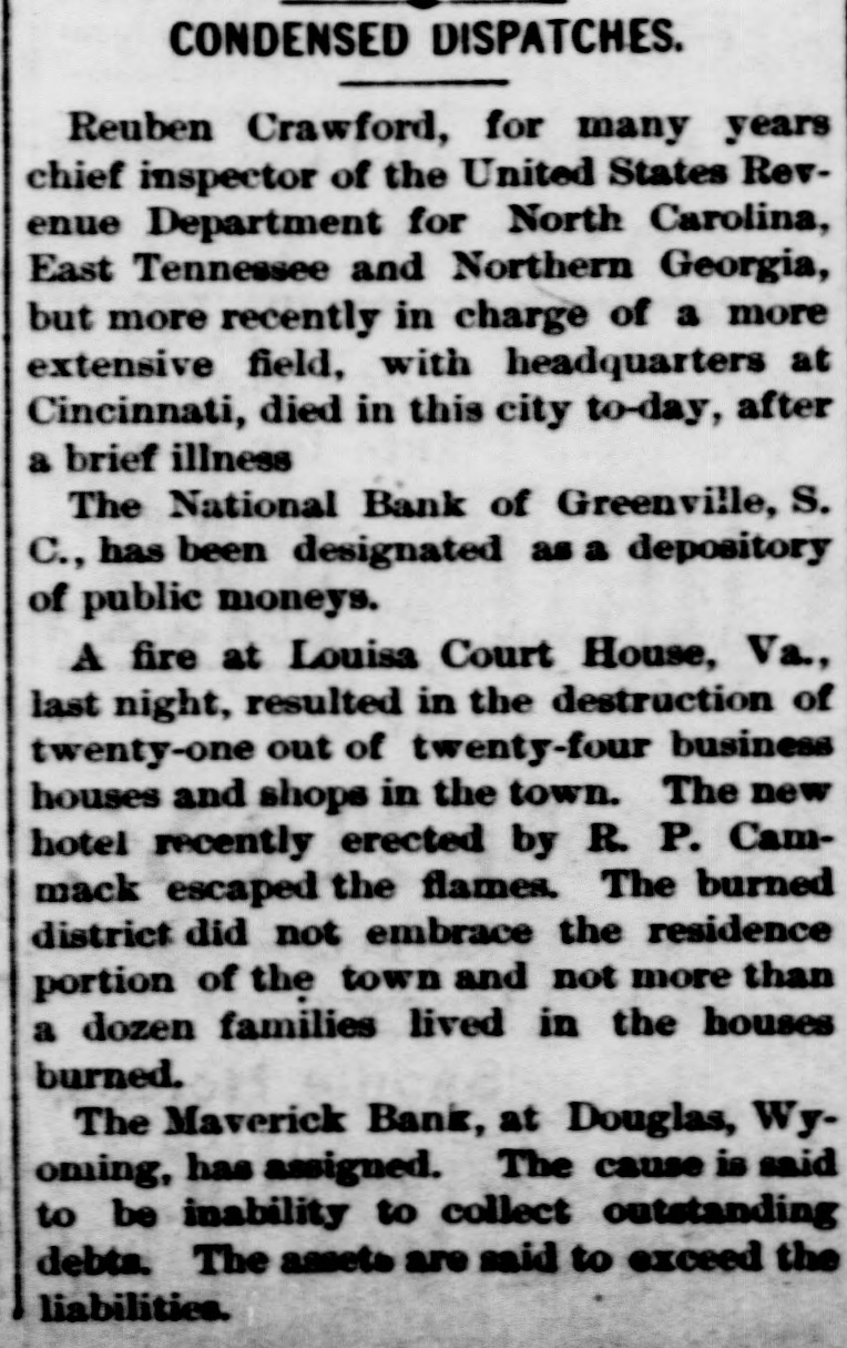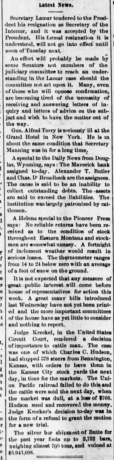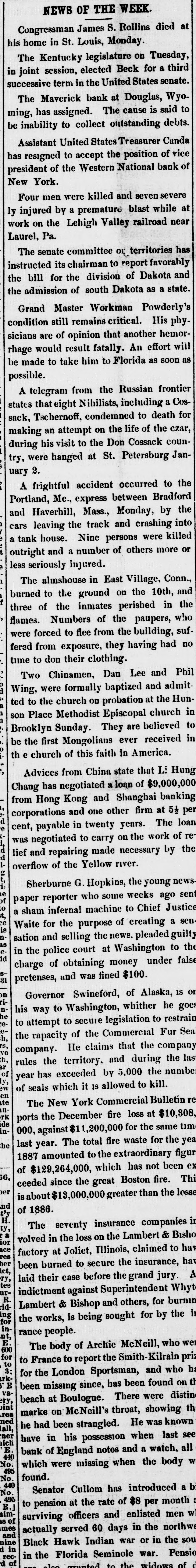 NEWS OF THE WEEK. Congressman James S. Rollins died at his home in St. Louis, Monday. The Kentucky legislature on Tuesday, in joint session, elected Beck for a third successive term in the United States senate. The Maverick bank at Douglas, Wyoming, has assigned. The cause is said to be inability to collect outstanding debts. Assistant United States Treasurer Canda has resigned to accept the position of vice president of the Western National bank of New York. Four men were killed and seven severe ly injured by a premature blast while at work on the Lehigh Valley railroad near Laurel, Pa. The senate committee or, territories has instructed its chairman to report favorably the bill for the division of Dakota and the admission of south Dakota as a state. Grand Master Workman Powderly's condition still remains critical. His physicians are of opinion that another hemorrhage would result fatally. An effort will be made to take him to Florida as soon possible. A telegram from the Russian frontier states that eight Nibilists, including a Cossack, Tschernoff, condemned to death for making an attempt on the life of the czar, during his visit to the Don Cossack country, were hanged at St. Petersburg January 2. A frightful accident occurred to the Portland, Me., express between Bradford and Haverhill, Mass., Monday, by the the track and into house. Nine persons were cars a tank leaving crashing killed outright and a number of others more or less seriously injured. The almshouse in East Village, Conn., burned to the ground on the 10th, and three of the innates perished in the flames. Numbers of the paupers, who were forced to flee from the building, suffered from exposure, they having had no time to don their clothing. Two Chinamen, Dan Lee and Phil Wing, were formally baptized and admitted to the church on probation at the Hunson Place Methodist Episcopal church in Brooklyn Sunday. They are believed to be the first Mongolians ever received in th e church of this faith in America. Advices from China state that Li Hung Chang has negotiated a loan of $9,000,000 from Hong Kong and Shanghai banking and one other per corporations firm The at 51 loan cent, payable in twenty years. was to carry on the re and made necessary the lief negotiated repairing work by of overflow of the Yellow river. Sherburne G. Hopkins, the young newspaper reporter who some weeks ago sent a sham infernal machine to Chief Justice Waite for the purpose of creating a senand the news, the court at sation in police selling Washington pleaded to guilty the charge of obtaining money under false pretenses, and was fined $100. Governor Swineford, of Alaska, is on his way to Washington, whither he goes to attempt to secure legislation to restrain the rapacity of the Commercial Fur Sea company. He claims that the company rules the territory, and during the last year has exceeded by 5,000 the number of seals which it 18 allowed to kill. The New York Commercial Bulletin ports the December fire loss at $10,308, in000, against $11,200,000 for the same tim the last year. The total fire waste for the yea 1887 amounted to the extraordinary figur of $129,264,000, which has not been 36. Thi ceeded since the great Boston fire. is about $13,000,000 greater than the losse nd of 1886. H. ty, The seventy insurance companies volved in the loss on the Lambert & Bisho at Joliet, Illinois, factory claimed insurance, to hav hav been burned to secure the ry, laid their case before the grand jury tes indictment against Superintendent Whyt R rd Lambert & Bishop and others, for burnin ing for the works, is being sought for by the inrance people. int, 600 The body of Archie McNeill, who for to France to report the Smith-Kilrain priz to 3: for the London Sportsman, and who ha rkE been missing since, has been found on vabeach at Boulogue. There were distin ery, bint Irea marke on McNeill's throat, showing th ned he had been strangled. He was known all, have in his possession when last see hich 'E. bank of England notes and a watch. all 440 No which were missing when the body 495 found. No. 440 No. Senator Cullom has introduced a bi 495 E. to pension at the rate of $8 per month aimof surviving officers and enlisted men imes served 60 days in and nine Indian war or sou actually Black Hawk the in northwe the in recin the Florida Seminole war. Pensio d of and aranted to the widows of