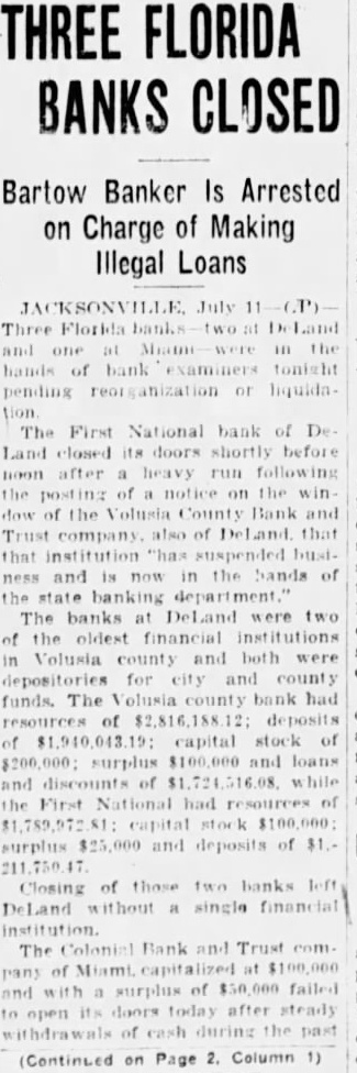 HEAD OF FOUR FLORIDA BANKS FACES CHARGES Three Other Institutions in Process of Reorganization or Liquidation: Irregularities Charged. JACKSONVILLE. Fla., July 12(AP) While state and Federal officers began reorganization or liquidation for three Florida banks today. the prestof four other Central Florida dent banking institutions faced charges of violation of the state banking laws. Two of the banks that closed yesterday were in De Land, the only banks in that city. They were the Volusia County Bank and Trust Company and the First National Bank of De Land. which shut its doors during the morning after a heavy run precipitated by the closing of the Volusta County Bank. The third Institution was the Colonon? Bank and Trust Company of Miami John L. Fouts, who made bond of $10,000 after his arrest on an information filed by State Solicitor Har. din Peterson of Polk County, president and director of the State Bank of Bartow, the First National Bank of Lakeland. the First National Bank Auburndale. and the State Bank Winter Information filed against Fouts in three counts charged he had "loaned" himself $5000 from the funds of the State Bank of Bartow without consent of the board of directors. that he had altered the minutes of the board and make the loan appear that he had taken the money when resources of the institution were not up The banks he to legal headed closed May The Colonial Bank and Trust Company was capitalized at $100,000. with surplus of $50,000. It had been ganized for three years, and attributed 118 closing to steady withdrawals cash during the four days. J. Carpenter president County Bank and Trust The Volusia Company had resources of $2,816.188.12: deposits of capital stock of $200,000 surplus and discounts of The First National Bank De Land had resources of capital stock of surplus of and deposits of $1,211,750.47.
