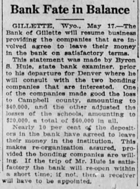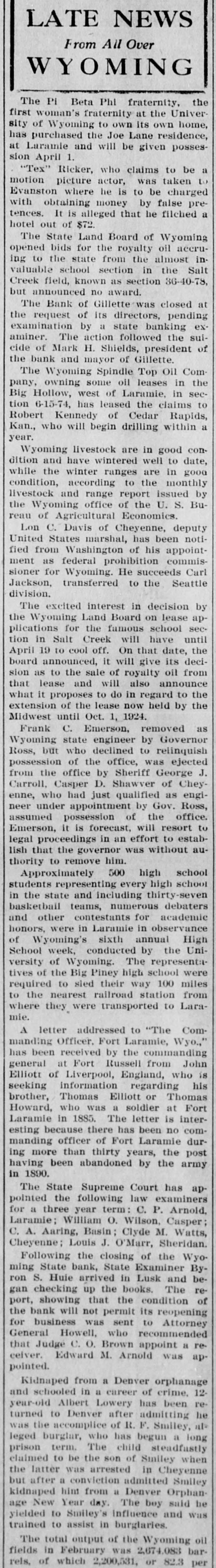 LATE NEWS From All Over WYOMING The Pi Beta Phi fraternity, the t woman's fraternity at the Univerhome UMO su UMO 01 Мишолм To purchased the Joe Lane residence, posses- blven be IIIM pun 1 1 April 1. Tex" Ricker, who claims to be a ion picture actor, was taken to inston where he is to be charged h obtaining money by false preces. It is alleged that he filched a 722 JO quo 1ª he State Land Board of Wyoming ned bids for the royalty oil accruto the state from the almost inuable school section in the Salt ek field, known as section 36-40-78, "DIBAB ou peonnomur 'he Bank of Gilletterwas closed at request of its directors, pending mination by a state banking exner. The action followed the suie of Mark H. Shields, president of bank and mayor of Gillette. he Wyoming Spindle Top Oil Comy, owning some oil leases in the Hollow, west of Laramie, in sec1 6-15-74, has leased the claims to ert Kennedy of Cedar Rapids, 1., who will begin drilling within a F. /yoming livestock are in good conon and have wintered well to date, le the winter ranges are in good dition, according to the monthly stock and range report issued by Wyoming office of the U. S. Bu1 of Agricultural Economics. on C. Davis of Cheyenne, deputy ted States marshal, has been notifrom Washington of his appointit as federal prohibition commiser for Wyoming. He succeeds Carl kson, transferred to the Seattle sion. he excited interest in decision by Wyoming Land Board on lease apations for the famous school sec1 in Salt Creek will have until il 19 to cool off. On that date, the rd announced, it will give its deci1 as to the sale of royalty oil from t lease and will also announce it it proposes to do in regard to the ension of the lease now held by the west until Oct. 1, 1924. rank C. Emerson, removed as oming state engineer by Governor S, but who declined to relinquish session of the office, was ejected n the office by Sheriff George J. roll, Casper D. Shawver of Cheye, who had just qualified as engi1° under appointment by Gov. Ross, umed possession of the office. erson, it is forecast, will resort to 11 proceedings in an effort to estabthat the governor was without aurity to remove him. pproximately 500 high school lents representing every high school he state and including thirty-seven ketbail teams, numerous debaters other contestants for academic ors, were in Laramie in observance Wyoming's sixth annual High