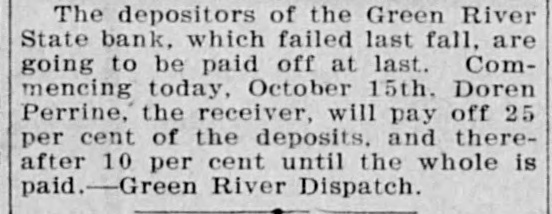The depositors of the Green River State bank. which failed last fall, are going to be paid off at last. Commencing today, October 15th. Doren Perrine, the receiver, will pay off 25 per cent of the deposits. and thereafter 10 per cent until the whole is paid. Green River Dispatch.