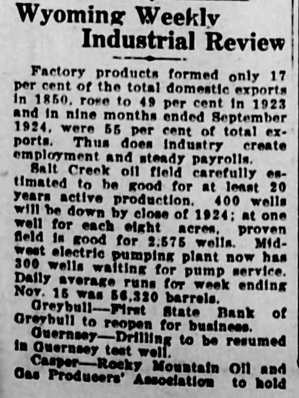 Wyoming Weekly Industrial Review Factory products formed only 17 per cent of the total domestic exports In 1850, rose to 49 per cent In 1923 and in nine months ended September 1924. were 55 per cent of total exports. Thus does industry create employment and steady payrolls. Salt Creek oil field carefully estimated to be good for at least 20 years active production. 400 wells will be down by close of 1924; at one well for each eight acres, proven field In good for 2.575 wells. Midwest electric pumping plant now has 300 wells waiting for pump service. Daily average runs for week ending Nov. 15 was 56,320 barrels. Greybull-First State Bank of Greybull to reopen for business. Guernsey-Drilling to be resumed in Guernsey test well. Casper-Rocky Mountain on and Gas Producers' Association to hold