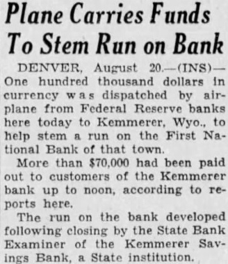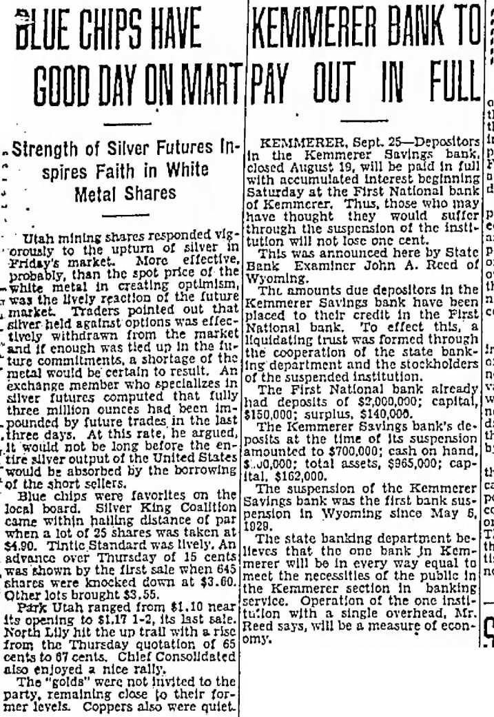 KEMMERER, Sept. 25-Depositors the Savings closed August 19, will be paid in full with beginning Saturday at the First bank of Kemmerer. Thus, those may have thought they would suffer through the suspension of the instltution will not lose one This here by State Bank Examiner John A. Reed of The amounts due depositors in the have been placed to their in the First National bank. To effect this, liquidating trust was formed through the cooperation of the state banking department and the stockholders the suspended institution. The First bank already of $2,000,000; capital, surplus, $140,000. The Kemmerer Savings bank's deposits at the time of Its suspension amounted to $700,000; cash on hand, by 00,000: total assets, $965,000; cap$162,000. The suspension of the Kemmerer Savings bank the first bank suspension in Wyoming since May 6, The state banking department believes that the one bank in Kemmerer will be in every way equal the of the public in the section in banking service. Operation of the one institu:lon with single overhead, Mr. Reed says, will be a measure of economy.