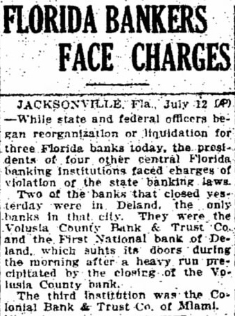 Two of the banks that closed yesterday were in Deland... the First National Bank of Deland, which shut its doors during the morning after heavy run precipitated by the closing of the Volusia County Bank.