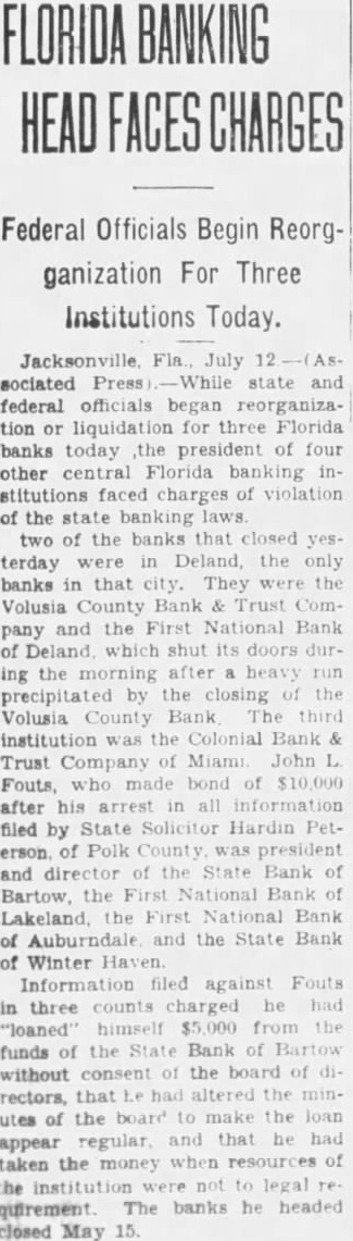 THREE BANKS CLOSE RESULT RUNS Head Of Four Other Institutions Faces Charges July 12. state and federal offictals began reorganization or liquidation for three Florida banking institutions faced charges of violating the state laws. Two of the banks that closed yesterday were in Deland, the only banks in that They were the Volusia County Bank and Trust Company the First National Bank Deland, which shut doors during the morning after heavy run precipitated by the closVolusia County Bank. ing the third institution the Coloriial Bank and Trust Company of Miami. John made bond of $10,000 his arrest on information filed by State Solicitor Hardin county, was president and the State Pank of Bartow, the First National Bank Lakeland, the First NationBank of and the Bank of Winterhaven filed against Fouts in he had "loancounts himselg $5,000 the funds of the State Bank of Bartow withboard of direcout tors, that altered the utes of the board make the loan that had appear regular and the when of the institution not up to legal The banks he headed closed May Time of arraignment for preliminary hearing expected to be set few days. The Colonial Bank and Trust Company surplus of $50,000. Its closing was attributed to steady withdrawals during the last few days. J. Carpenter was president. The Volusia County Bank and Trust Company had resources of deposits of 082.19; capital stock surplus of $100,000 and discounts The First National Bank of Deland had stock of