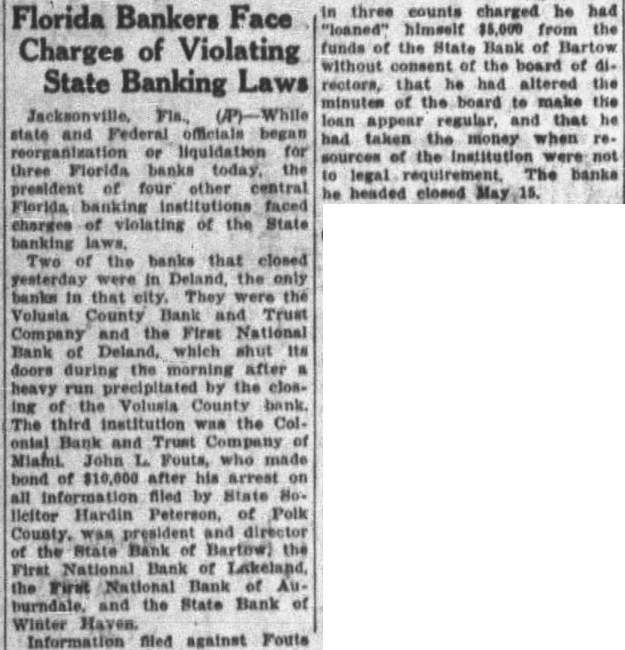 FLORIDA PRESENTS BANKING PROBLEMS Three Banks Closed-President Of Four Others Facing Charges JACKSONVILLE, Fla, July While State and Federal officers began reorganization or liquidation for three Florida banks today, the president of four other Central Florida banking stitutions faced charges of violating the State banking laws. Two of the banks that closed yesterday were in Deland, the only banks in that city. They were the Volusia County Bank and Trust Company and the First National Bank of Deland, which shut its doors during the morning after heavy run precipitated by closing of the Volusia County Bank. The third institution was the Colonial Bank and Trust Company of Miami. John L. Fouts, who made bond of $10,000 after his arrest on an information filed by State Solicitor Hardin Peterson of Polk County, was president and director of the State Bank Barton, the First National Bank of Lakeland, the First National Bank Auburndale, and the State Bank of Winter Haven. Information filed against Fouts in three counts charged he had "loaned" himself $5,000 from the funds of the State Bank of Barton without consent of the board of directors, that he had altered the minutes of the board to make the loan appear regular, and that he had taken the mony when of the institution were not up to legal requirement. The banks he headed closed May 15. The Colonial Bank and Trust Company was capitalized at $100,000. with surplus of $50,000. It had been organized three years, and attributed its closing to steady withdrawals cash during the last four days. J. was president The Volusia County Bank and Trust Company had resources of deposits of capital stock of $200,000; surplus of $100,000, and discounts of $1,724,516.08. The First National Bank of Deland had resources of capital stock of $100,000; surplus of $25,000, and deposits of $1,211,750.47.
