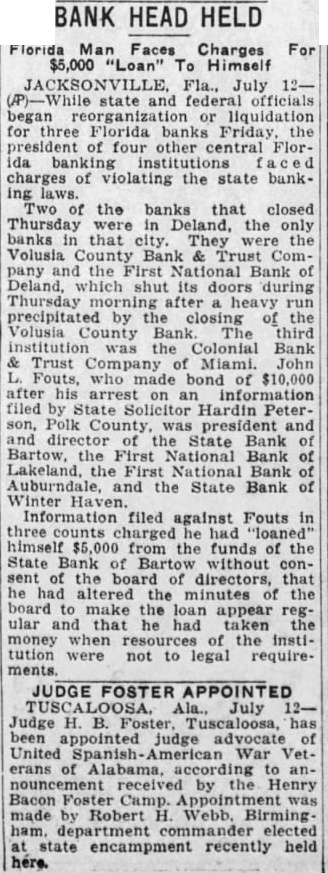 BANK HEAD HELD Florida Man Faces Charges For $5,000 "Loan" To Himself JACKSONVILLE Fla., July 12(P)-While state and federal officials began reorganization or liquidation for three Florida banks Friday, the president of four other central Flor ida banking institutions charges of violating the state banking laws. Two of the banks that closed Thursday were in Deland, the only banks in that city. They were the Volusia County Bank & Trust Company and the First National Bank of Deland, which shut its doors during Thursday morning after heavy run precipitated by the closing of the Volusia County Bank The third institution was the Colonial Bank Trust Company of Miami. John Fouts, who made bond of $10,000 after his arrest on an information filed by State Solicitor Hardin PeterPolk County, was president and and of the State Bank of Bartow, the First National Bank of Lakeland, the First National Bank Auburndale, and the State Bank of Winter Haven. Information filed against Fouts in three charged had "loaned" himself $5,000 from the funds of the State Bank of Bartow without consent of the board of directors, that he had altered the minutes of the board to make the loan appear regular and that had taken money when the institution were not to legal requirements JUDGE FOSTER APPOINTED Ala., July 12Judge H. B. Foster. Tuscaloosa, has been appointed judge advocate of United Spanish- American War Veterans of Alabama, to announcement received by the Henry Bacon Foster Camp. was made by Robert H. Webb. Birming ham. department commander elected at state encampment recently held here.