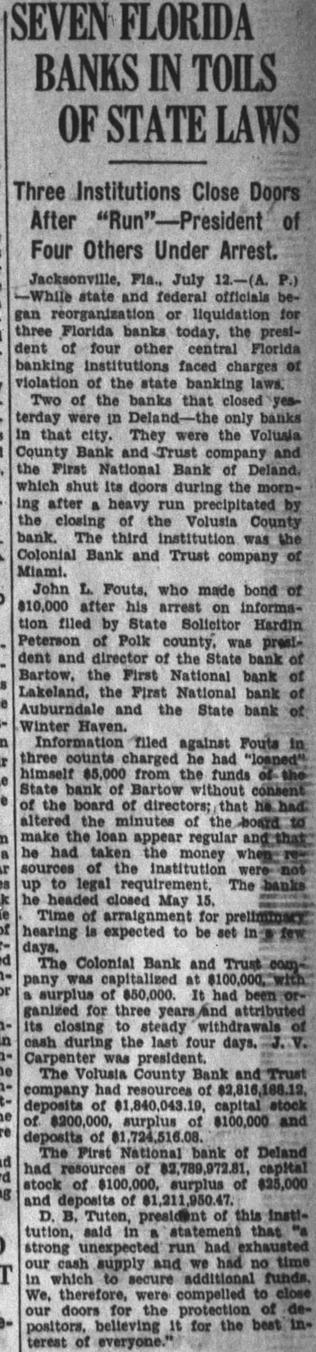 SEVEN FLORIDA BANKS IN TOILS OF STATE LAWS Three Institutions Close Doors After "Run"-President of Four Others Under Arrest. Jacksonville, Fla., July 12.-(A. P.) -While state and federal officials began reorganization or liquidation for three Florida banks today, the president four other central Florida banking faced charges of violation of the state banking laws. Two of the banks that closed yesterday were in Deland- only banks in that city. They the Volusia County Bank and Trust and the First National Bank of Deland. which shut its doors during the morning after heavy run precipitated by the closing the Volusia County bank. The third institution was the Colonial Bank and Trust company of Miami. John L. Fouts, who made bond of $10,000 after his arrest on information filed by State Solicitor Hardin Peterson of Polk county, president and director of the State bank of Bartow, the First National bank of Lakeland, the First National bank of Auburndale the State bank of Winter Haven. Information filed against Fouts in three counts charged he had "loaned" himself $5,000 from the funds of State bank of Bartow without consent of the board of directors; that he. altered the minutes of the board to make the loan appear regular he had taken the money when_ of the institution up to legal requirement. The banks he headed closed May 15. Time of arraignment for hearing is expected to be set ing few The Colonial Bank and Trust company was capitalized at $100,000." surplus of $50,000. It had been ganized for three years/and attributed its closing to steady withdrawals of cash during the last four days. V. Carpenter president. The Volusia County Bank and Trust company had resources of $2,816,188.12. deposits of $1,840,043. capital stock of $200,000, surplus $100,000 and deposits of $1,724,516.08. The First National bank of Deland had of capital stock of $100,000. $25,000 and deposits of $1,211,950.47 D. Tuten, president of this institution, said in that strong run had our cash supply and we had no time in which to funds. We, therefore, were compelled to our doors the protection of depositors, believing It for the best interest of everyone."