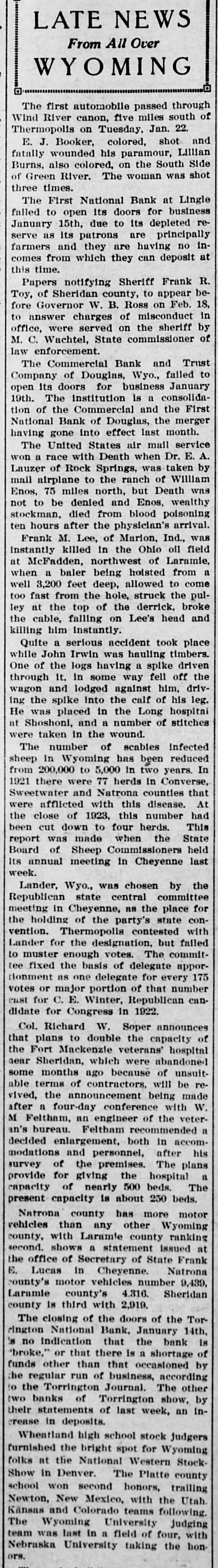 LATE NEWS From All Over WYOMING The first automobile passed through of Wind River canon, five miles south Thermopolis on Tuesday, Jan. 22. E. J. Booker, colored, shot and fatally wounded his paramour, Side Lillian Burns, also colored, on the South shot of Green River. The woman was three times. The First National Bank at Lingle failed to open its doors for re- business January 15th, due to its depleted serve as its patrons are principally infarmers and they are having no at comes from which they can deposit this time. Papers notifying Sheriff Frank be- R. Toy, of Sheridan county, to appear 18, fore Governor W. B. Ross on Feb. in to answer charges of misconduct by office, were served on the sheriff of M. C. Wachtel, State commissioner law enforcement. The Commercial Bank and to Trust Company of Douglas, Wyo., failed January open its doors for business 19th. The institution is a First consolidation of the Commercial and the National Bank of Douglas, the merger having gone into effect last month. The United States air mail A. service won a race with Death when Dr. E. by Lauzer of Rock Springs, was taken mail airplane to the ranch of William was Enos, 75 miles north, but Death wealthy not to be denied and Enos, stockman, died from blood arrival. poisoning ten hours after the physician's Frank M. Lee, of Marion, Ind., was instantly killed in the Ohio oil Laramie, field at McFadden, northwest of when a baler being hoisted from a well 3,200 feet deep, allowed to come too fast from the hole, struck the pul- broke ley at the top of the derrick, and the cable, falling on Lee's head killing him instantly. Quite a serious accident took place while John Irwin was hauling timbers. driven One of the logs having a spike the through it. in some way fell off drivwagon and lodged against him, Ing the spike into the calf of his leg. He was placed in the Long hospital at Shoshoni, and a number of stitches were taken in the wound. The number of scables infected sheep in Wyoming has been In reduced from 200,000 to 5,000 in two years. 1921 there were 77 herds in Converse, Sweetwater and Natrona counties that were afflicted with this disease. At the close of 1923, this number had been cut down to four herds. This State report was made when the held Board of Sheep Commissioners last Its annual meeting In Cheyenne week. Lander, Wyo., was chosen by the Republican state central for committee meeting in Cheyenne, as the place the holding of the party's state convention. Thermopolis contested with Lander for the designation, but failed to muster enough votes. The committee fixed the basis of delegate appor- 175 Honment as one delegate for every votes or major portion of that number cust for C. E. Winter, Republican candidate for Congress in 1922. Col. Richard W. Soper announces plans to double the capacity of
