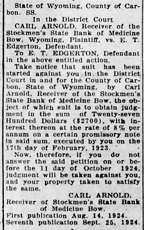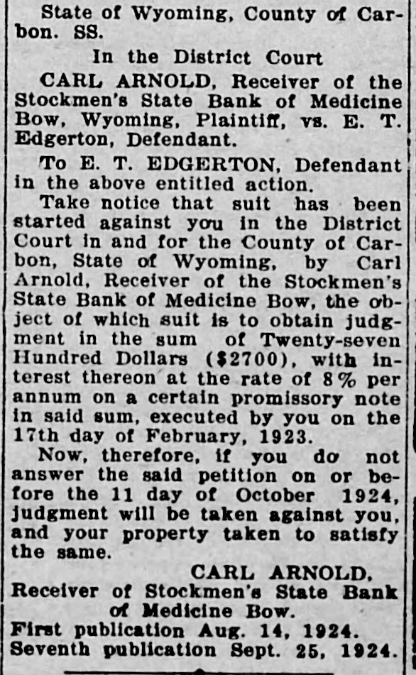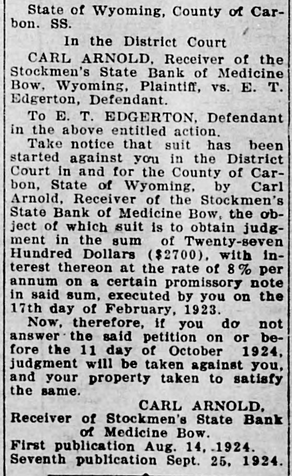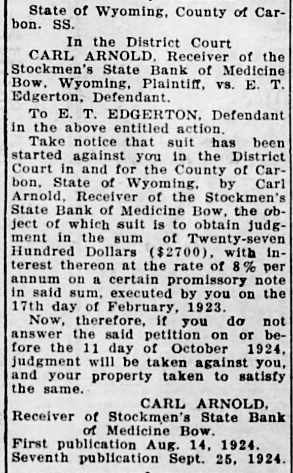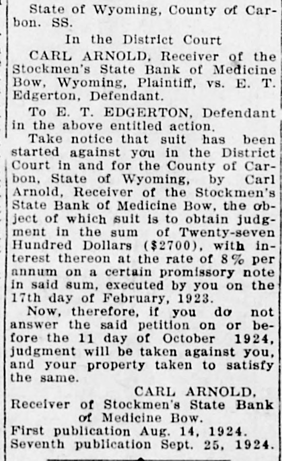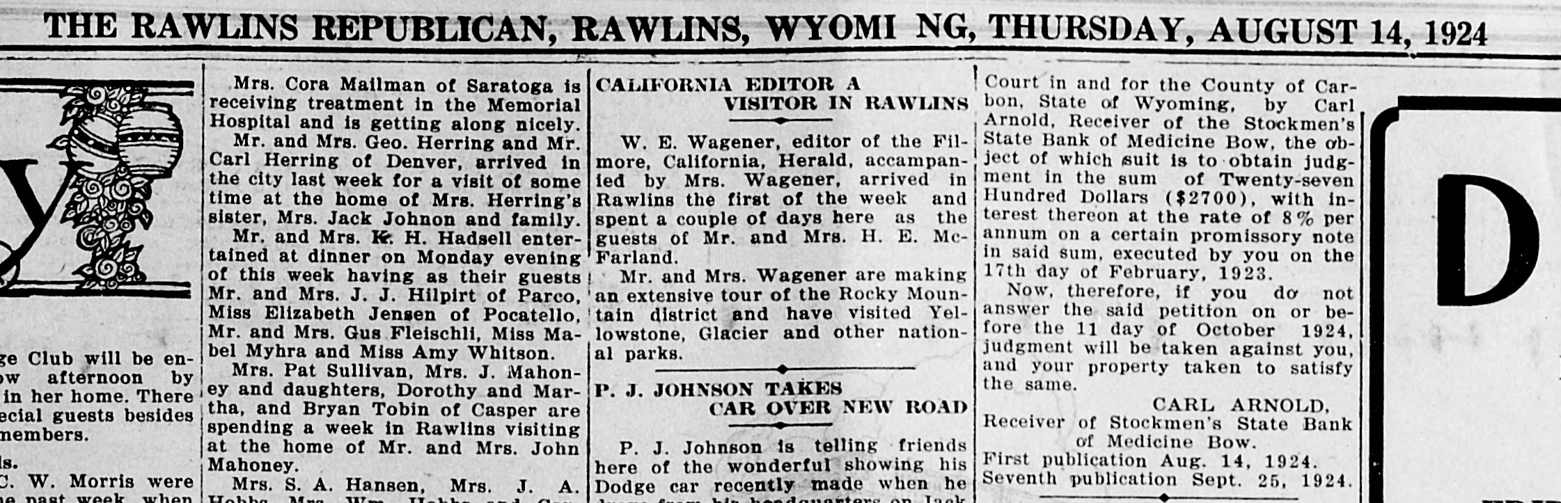 THE RAWLINS REPUBLICAN, RAWLINS, WYOMI NG, THURSDAY, AUGUST 14, 1924 CALIFORNIA EDITOR A Court in and for the County of CarMrs. Cora Mailman of Saratoga is VISITOR IN RAWLINS receiving treatment in the Memorial bon, State of Wyoming, by Carl Arnold, Receiver of the Stockmen's Hospital and is getting along nicely. State Bank of Medicine Bow, the obW. E. Wagener, editor of the FilMr. and Mrs. Geo. Herring and Mr. more, California, Herald, accampanject of which suit is to obtain judgCarl Herring of Denver, arrived in the city last week for a visit of some ment in the sum of Twenty-seven ied by Mrs. Wagener, arrived in Rawlins the first of the week and Hundred Dollars ($2700), with intime at the home of Mrs. Herring's terest thereon at the rate of 8% per spent a couple of days here as the sister, Mrs. Jack Johnon and family. Mr. and Mrs. K. H. Hadsell enterannum on a certain promissory note guests of Mr. and Mrs. H. E. Mcin said sum, executed by you on the Farland. tained at dinner on Monday evening 17th day of February, 1923. Mr. and Mrs. Wagener are making of this week having as their guests Now, therefore, if you do not an extensive tour of the Rocky MounMr. and Mrs. J. J. Hilpirt of Parco, D answer the said petition on or betain district and have visited YelMiss Elizabeth Jensen of Pocatello, fore the 11 day of October 1924, Mr. and Mrs. Gus Fleischli, Miss Malowstone, Glacier and other nationjudgment will be taken against you, bel Myhra and Miss Amy Whitson. al parks. Club will be enand your property taken to satisfy Mrs. Pat Sullivan, Mrs. J. Mahonafternoon by the same. P. J. JOHNSON TAKES ey and daughters, Dorothy and Marin her home. There CARL ARNOLD, CAR OVER NEW ROAD tha, and Bryan Tobin of Casper are ecial guests besides Receiver of Stockmen's State Bank spending a week in Rawlins visiting nembers. of Medicine Bow. P. J. Johnson is telling friends at the home of Mr. and Mrs. John First publication Aug. 14, 1924. Mahoney. here of the wonderful showing his W. Morris were Seventh publication Sept. 25, 1924. Mrs. S. A. Hansen, Mrs. J. A. Dodge car recently made when he Hobbs Mng. Wm Hobbe his heedauartore on Lack past week when