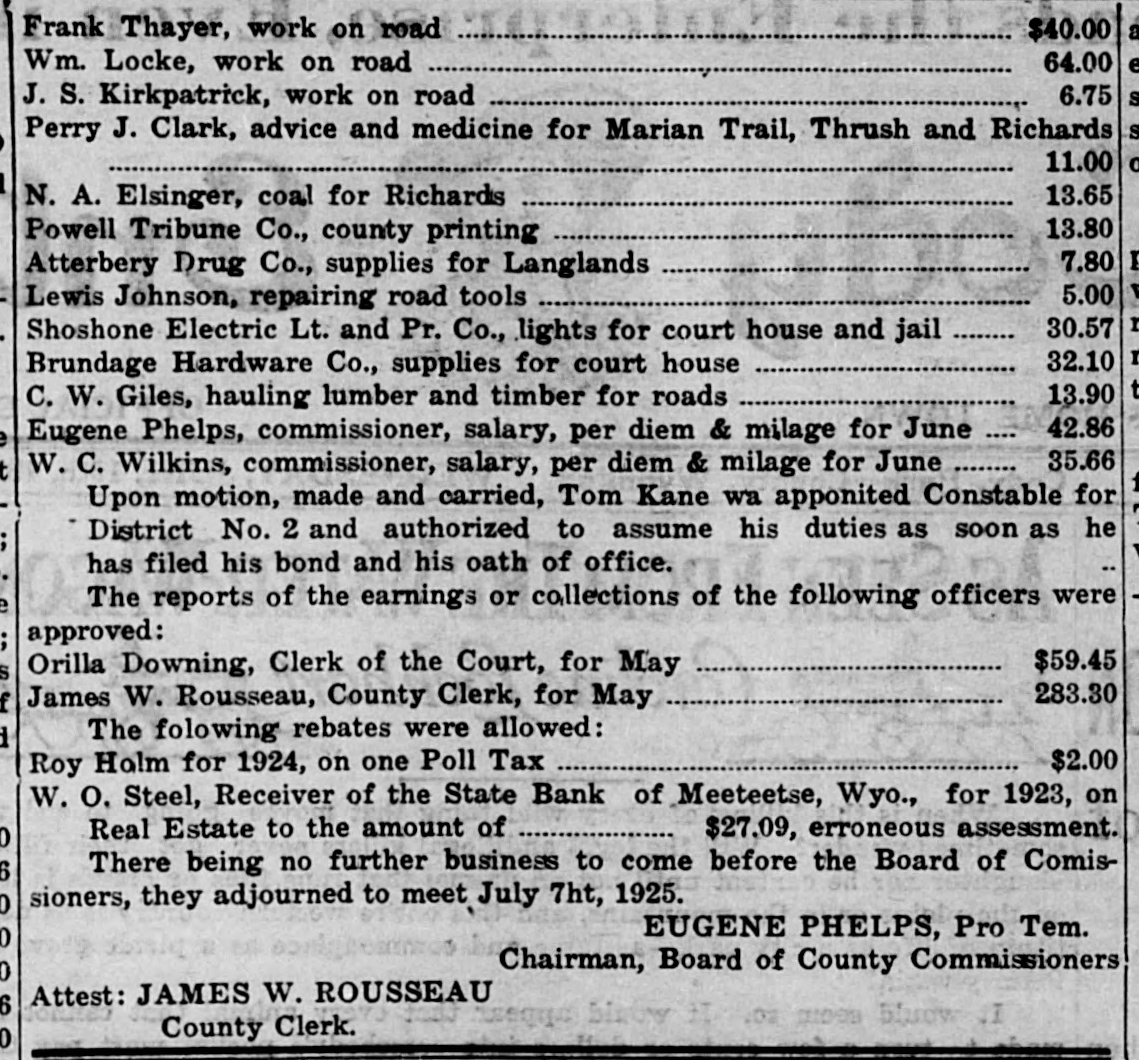 Frank Thayer, work on road $40.00 Wm. Locke, work on road 64.00 J. S. Kirkpatrick, work on road 6.75 Perry J. Clark, advice and medicine for Marian Trail, Thrush and Richards 11.00 N. A. Elsinger, coal for Richards 13.65 Powell Tribune Co., county printing 13.80 Atterbery Drug Co., supplies for Langlands 7.80 Lewis Johnson, repairing road tools 5.00 Shoshone Electric Lt. and Pr. Co., lights for court house and jail 30.57 Brundage Hardware Co., supplies for court house 32.10 C. W. Giles, hauling lumber and timber for roads 13.90 Eugene Phelps, commissioner, salary, per diem & milage for June 42.86 W. C. Wilkins, commissioner, salary, per diem & milage for June 35.66 Upon motion, made and carried, Tom Kane wa apponited Constable for District No. 2 and authorized to assume his duties as soon as he has filed his bond and his oath of office. The reports of the earnings or collections of the following officers were approved: Orilla Downing, Clerk of the Court, for May $59.45 James W. Rousseau, County Clerk, for May 283.30 The folowing rebates were allowed: Roy Holm for 1924, on one Poll Tax $2.00 W. O. Steel, Receiver of the State Bank of Meeteetse, Wyo., for 1923, on Real Estate to the amount of $27.09, erroneous assessment. There being no further business to come before the Board of Commissioners, they adjourned to meet July 7ht, 1925. EUGENE PHELPS, Pro Tem. Chairman, Board of County Commissioners Attest: JAMES W. ROUSSEAU County Clerk.