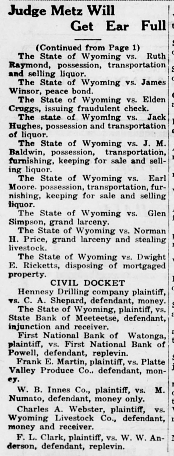 Judge Metz Will Get Ear Full (Continued from Page 1) The State of Wyoming vs. Ruth Raymond, possession, transportation and selling liquor. The State of Wyoming vs. James Winsor, peace bond. The State of Wyoming vs. Elden Cruggs, issuing fraudulent check. The state of Wyoming vs. Jack Hughes, possession and transportation of liquor. The State of Wyoming vs. J. M. Baldwin, possession, transportation, furnishing, keeping for sale and selling liquor. The State of Wyoming vs. Earl Moore. possession, transportation, furnishing, keeping for sale and selling liquor. The State of Wyoming vs. Glen Simpson, grand larceny. The State of Wyoming vs. Norman H. Price, grand larceny and stealing livestock. The State of Wyoming vs. Dwight E. Ricketts, disposing of mortgaged property. CIVIL DOCKET Hennesy Drilling company plaintiff, vs. C. A. Shepard, defendant, money. The State of Wyoming, plaintiff, vs. State Bank of Meeteetse, defendant, injunction and receiver. First National Bank of Watonga, plaintiff, vs. First National Bank of Powell, defendant, replevin. Frank E. Martin, plaintiff, vs. Platte Valley Produce Co., defendant, money. W. B. Innes Co., plaintiff, vs. M. Numato, defendant, money only. Charles A. Webster, plaintiff, vs. Wyoming Livestock Co., defendant, money and receiver. F. L. Clark, plaintiff, vs. W. W. Anderson, defendant, replevin.