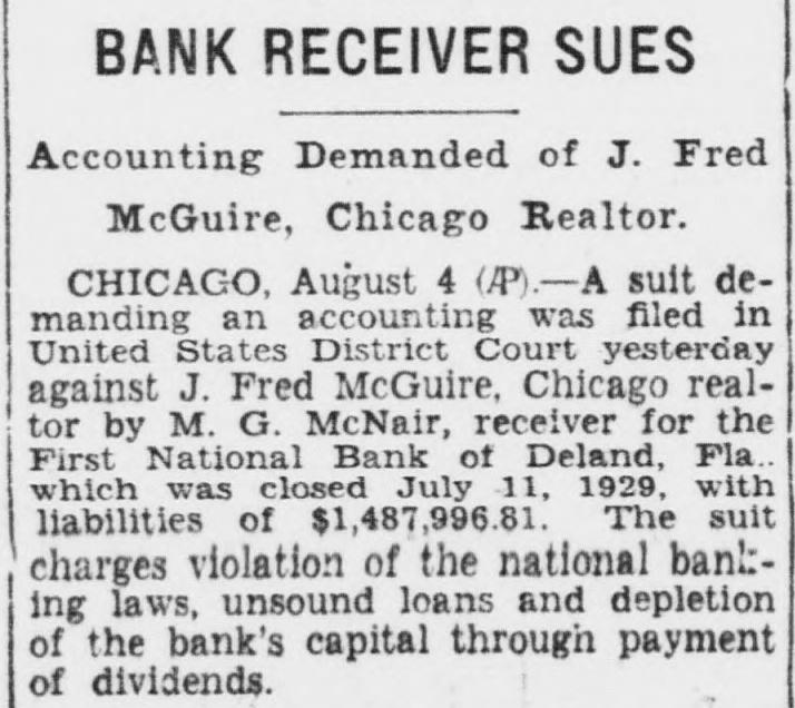 BANK RECEIVER SUES Accounting Demanded of J. Fred McGuire, Chicago Realtor. CHICAGO, August 4 (AP).-A suit demanding an accounting was filed in United States District Court yesterday against J. Fred McGuire, Chicago realtor by M. G. McNair, receiver for the First National Bank of Deland, Fla.. which was closed July 11, 1929, with liabilities of $1,487,996.81. The suit charges violation of the national bank:ing laws, unsound loans and depletion of the bank's capital through payment of dividends.