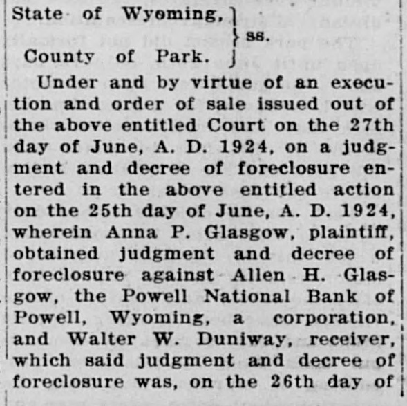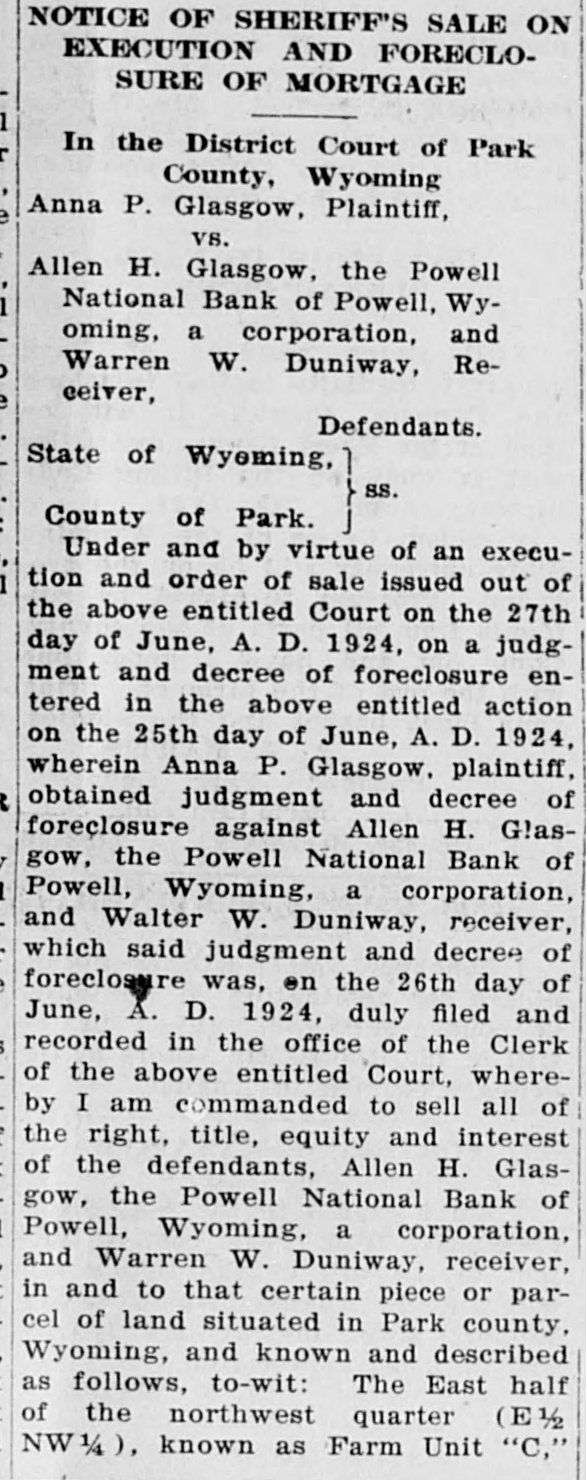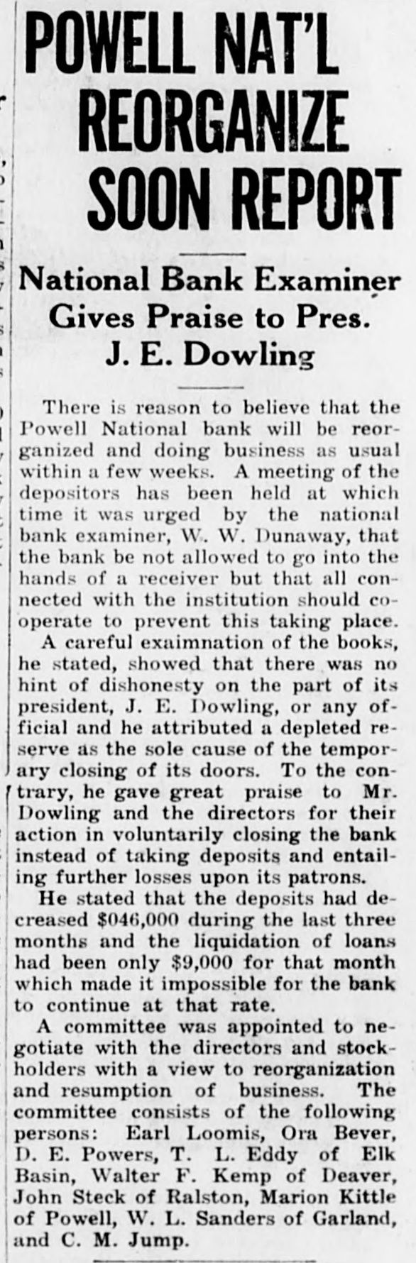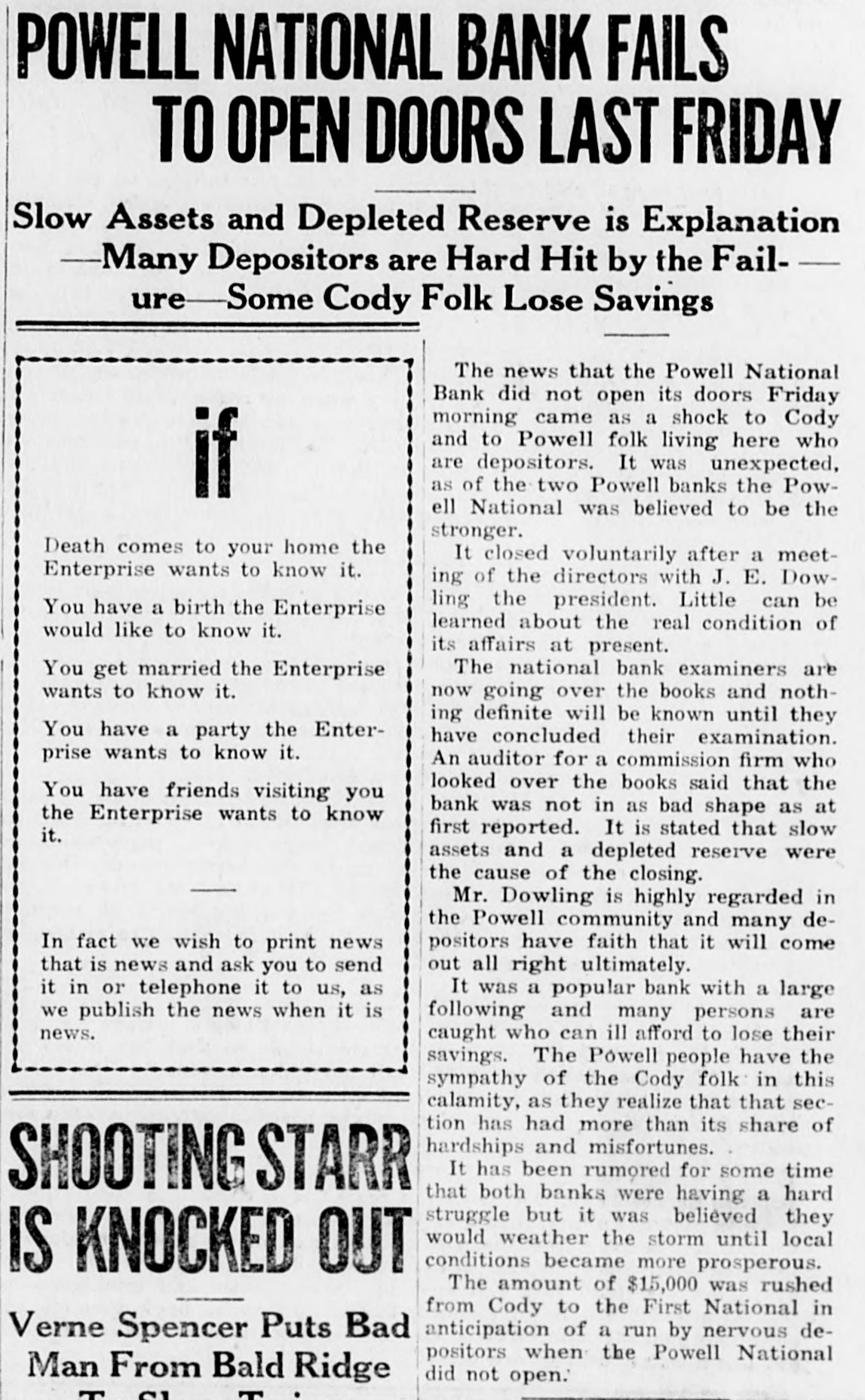 POWELL NATIONAL BANK FAILS TO OPEN DOORS LAST FRIDAY Slow Assets and Depleted Reserve is Explanation -Many Depositors are Hard Hit by the Failure-Some Cody Folk Lose Savings The news that the Powell National Bank did not open its doors Friday morning came as a shock to Cody and to Powell folk living here who are depositors. It was unexpected, as of the two Powell banks the Powif ell National was believed to be the stronger. Death comes to your home the It closed voluntarily after a meetEnterprise wants to know it. ing of the directors with J. E. Dowling the president. Little can be You have a birth the Enterprise learned about the real condition of would like to know it. its affairs at present. The national bank examiners are You get married the Enterprise wants to know it. now going over the books and nothing definite will be known until they You have a party the Enterhave concluded their examination. prise wants to know it. An auditor for a commission firm who looked over the books said that the You have friends visiting you bank was not in as bad shape as at the Enterprise wants to know first reported. It is stated that slow it. assets and a depleted reserve were the cause of the closing. Mr. Dowling is highly regarded in the Powell community and many depositors have faith that it will come In fact we wish to print news out all right ultimately. that is news and ask you to send it in or telephone it to us, as It was a popular bank with a large we publish the news when it is following and many persons are news. caught who can ill afford to lose their savings. The Powell people have the sympathy of the Cody folk in this calamity, as they realize that that section has had more than its share of hardships and misfortunes. It has been rumored for some time SHOOTING STARR that both banks were having a hard struggle but it was believed they would weather the storm until local conditions became more prosperous. IS KNOCKED OUT The amount of $15,000 was rushed from Cody to the First National in anticipation of a run by nervous deVerne Spencer Puts Bad positors when the Powell National Man From Bald Ridge did not open.'