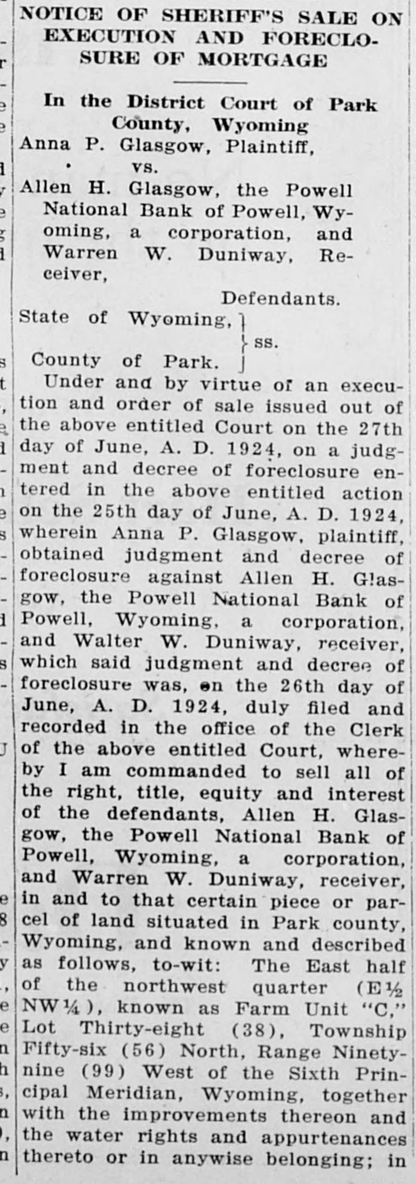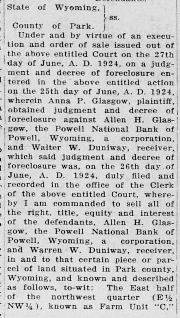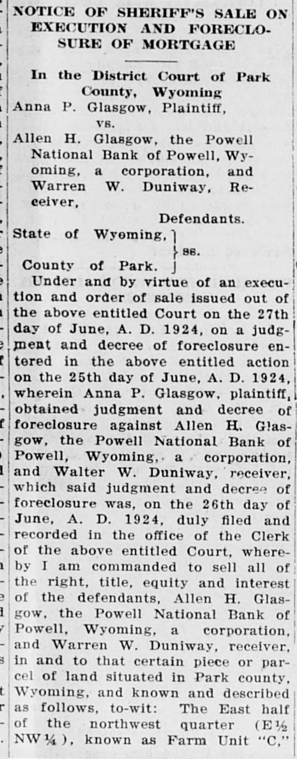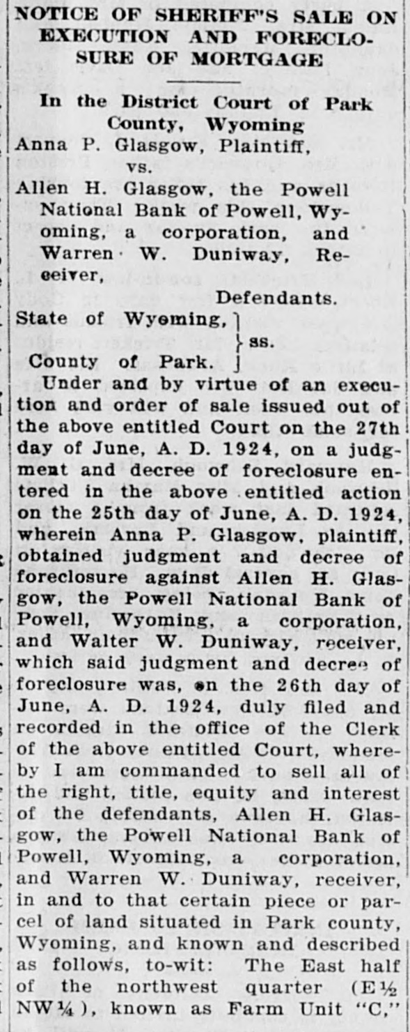 POWELL NATIONAL BANK FAILS TO OPEN DOORS LAST FRIDAY Slow Assets and Depleted Reserve is Explanation -Many Depositors are Hard Hit by the Failure-Some Cody Folk Lose Savings The news that the Powell National Bank did not open its doors Friday morning came as a shock to Cody and to Powell folk living here who are depositors. It was unexpected, as of the two Powell banks the Powif ell National was believed to be the stronger. Death comes to your home the It closed voluntarily after a meetEnterprise wants to know it. ing of the directors with J. E. Dowling the president. Little can be You have a birth the Enterprise learned about the real condition of would like to know it. its affairs at present. The national bank examiners are You get married the Enterprise wants to know it. now going over the books and nothing definite will be known until they You have a party the Enterhave concluded their examination. prise wants to know it. An auditor for a commission firm who looked over the books said that the You have friends visiting you bank was not in as bad shape as at the Enterprise wants to know first reported. It is stated that slow it. assets and a depleted reserve were the cause of the closing. Mr. Dowling is highly regarded in the Powell community and many depositors have faith that it will come In fact we wish to print news out all right ultimately. that is news and ask you to send it in or telephone it to us, as It was a popular bank with a large we publish the news when it is following and many persons are news. caught who can ill afford to lose their savings. The Powell people have the sympathy of the Cody folk in this calamity, as they realize that that section has had more than its share of hardships and misfortunes. It has been rumored for some time SHOOTING STARR that both banks were having a hard struggle but it was believed they would weather the storm until local conditions became more prosperous. IS KNOCKED OUT The amount of $15,000 was rushed from Cody to the First National in anticipation of a run by nervous deVerne Spencer Puts Bad positors when the Powell National Man From Bald Ridge did not open.'