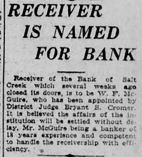 RECEIVER IS NAMED FOR BANK Receiver of the Bank of Salt Creek which several weeks ago closed its doors, is to be W. F. McGuire, who has been appointed by District Judge Bryant S. Cromer. It is believed the affairs of the institution will be settled without delay, Mr. McGuire being a banker of 18 years experience and competent to handle the receivership with effi. ciency.